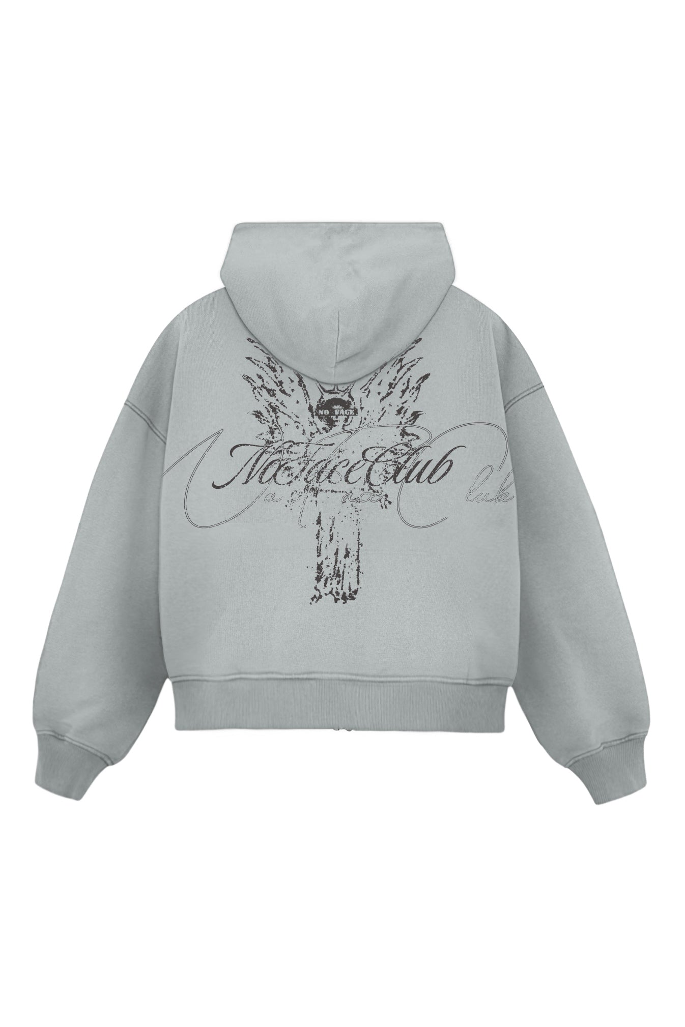 Зіп Худі вільного крою, виготовлене із бавовняної флісової тканини 320GSM. З об'ємним капюшоном, з кишенею спереду, принтом на грудях та спині.