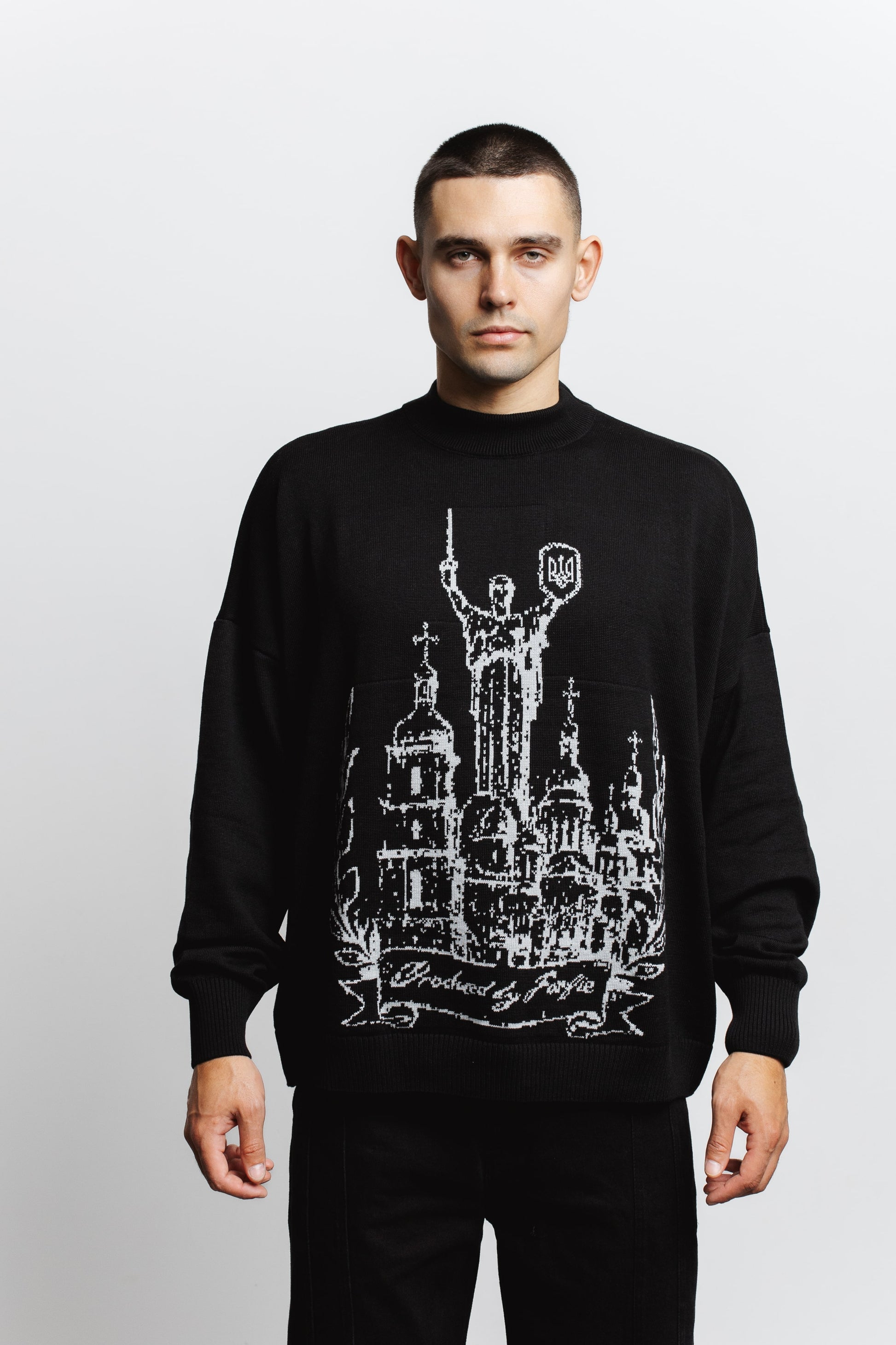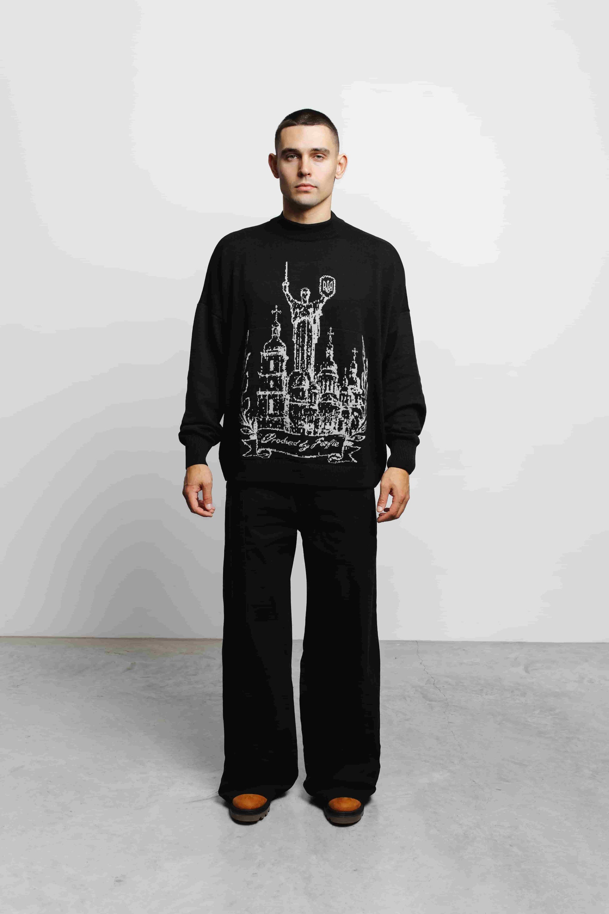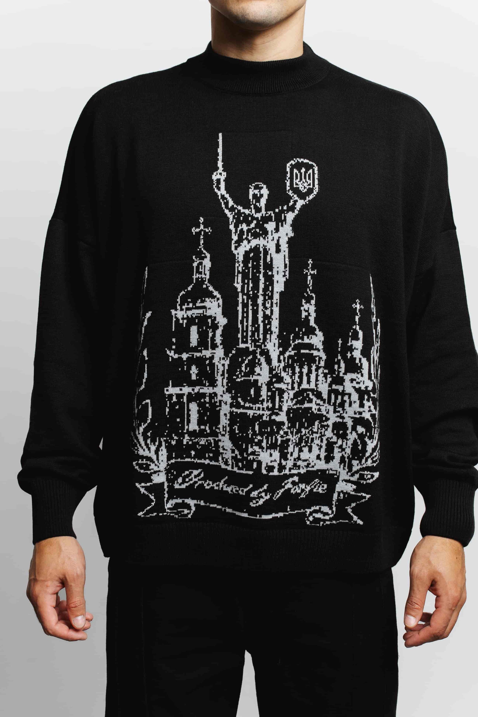 В’язаний светр вільного крою, виготовлений із вовняної пряжі. Має еластичні манжети, комір та низ виробу, принт на грудях.