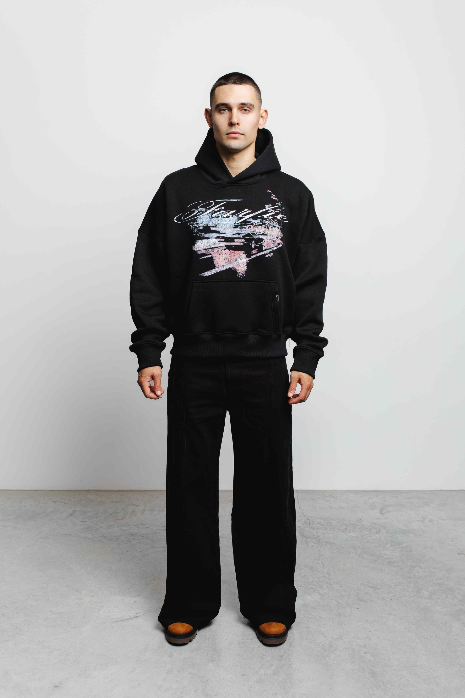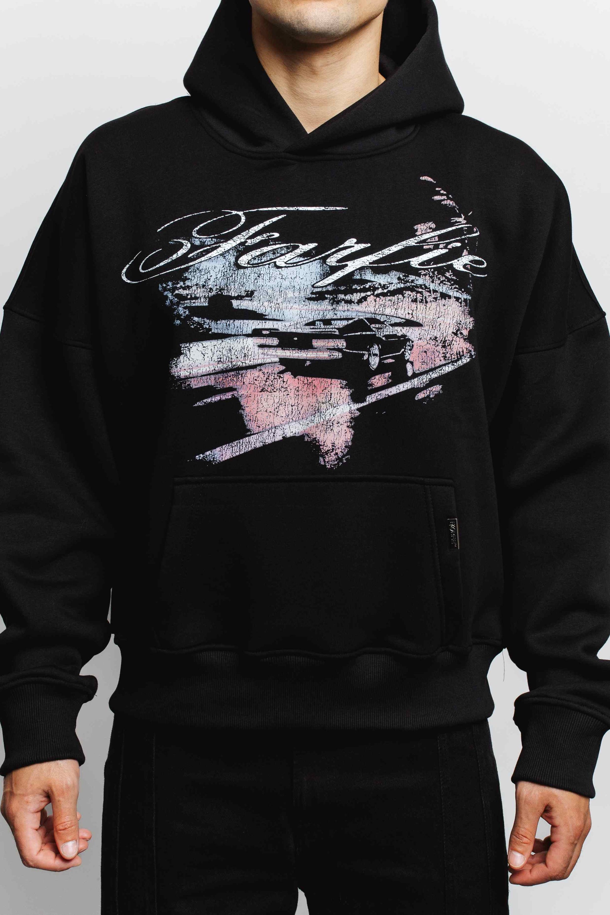 Худі вільного крою, виготовлене із бавовняної флісової тканини 250GSM. З об'ємним капюшоном, з кишенею спереду та принтом на грудях.