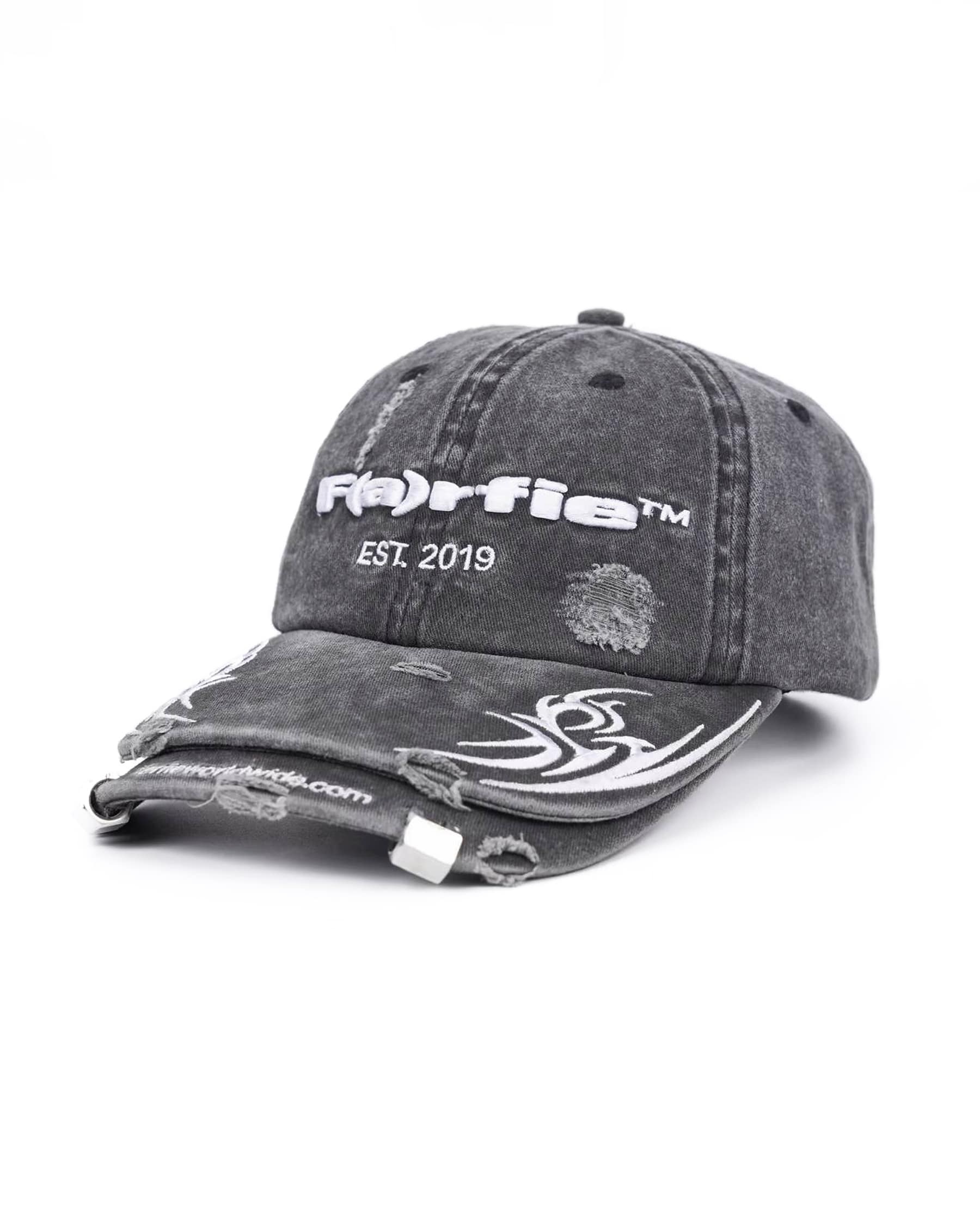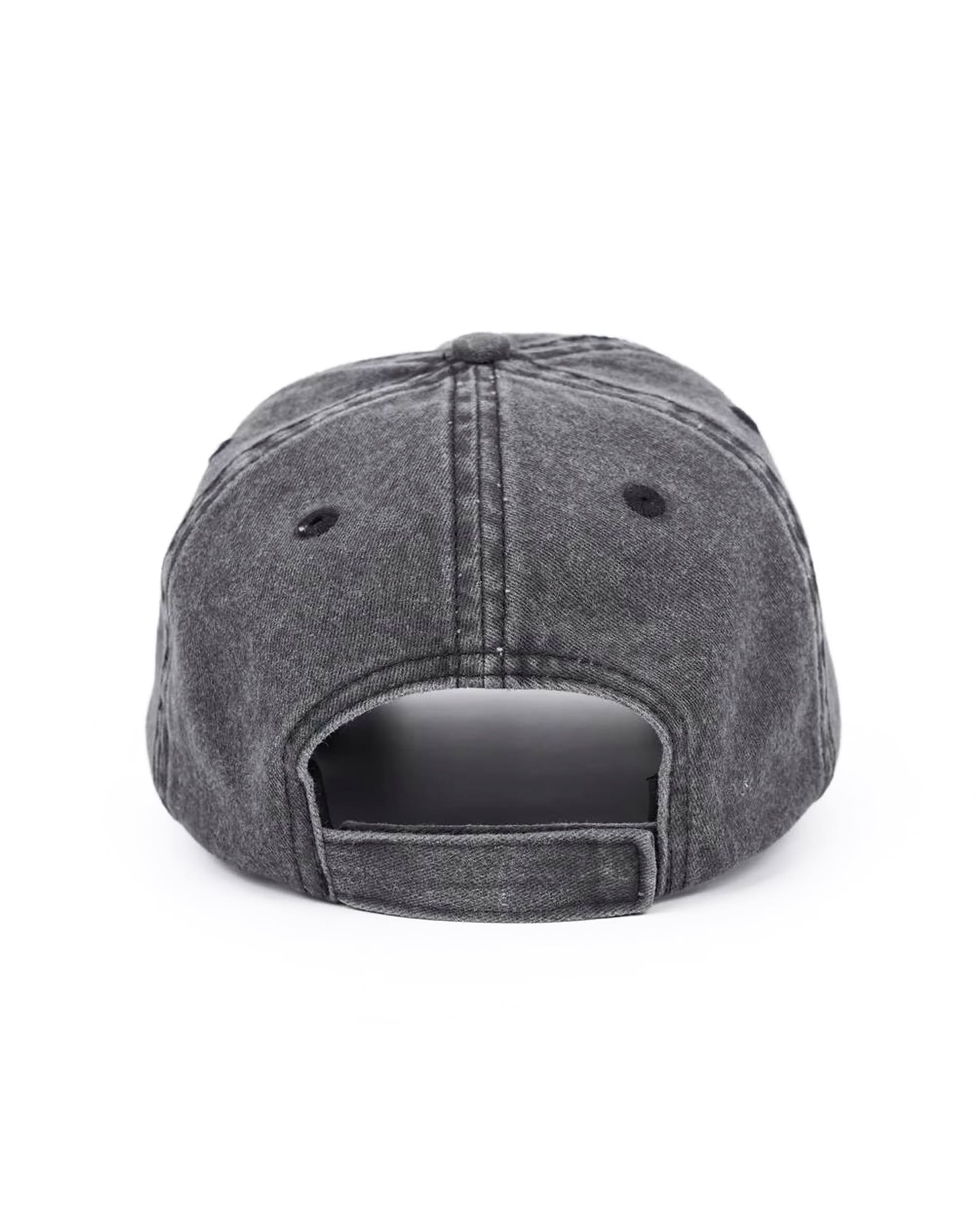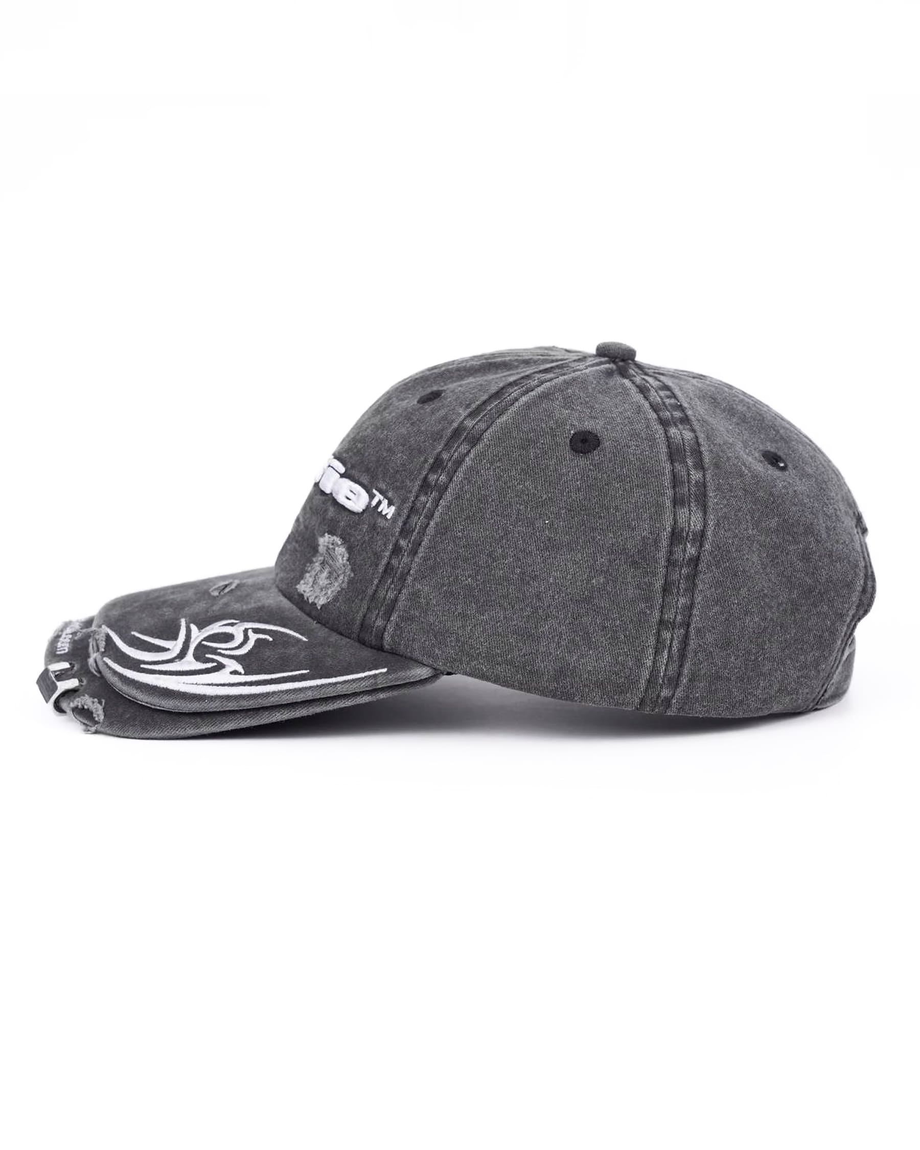 Кепка з зістареного сірого деніму з потертостями та рваними елементами, 3D вишивка логотипу, подвійний козирок і справжні болти. М'яка та зручна модель з підкладкою та застібкою, що дає можливість регулювати розмір.
