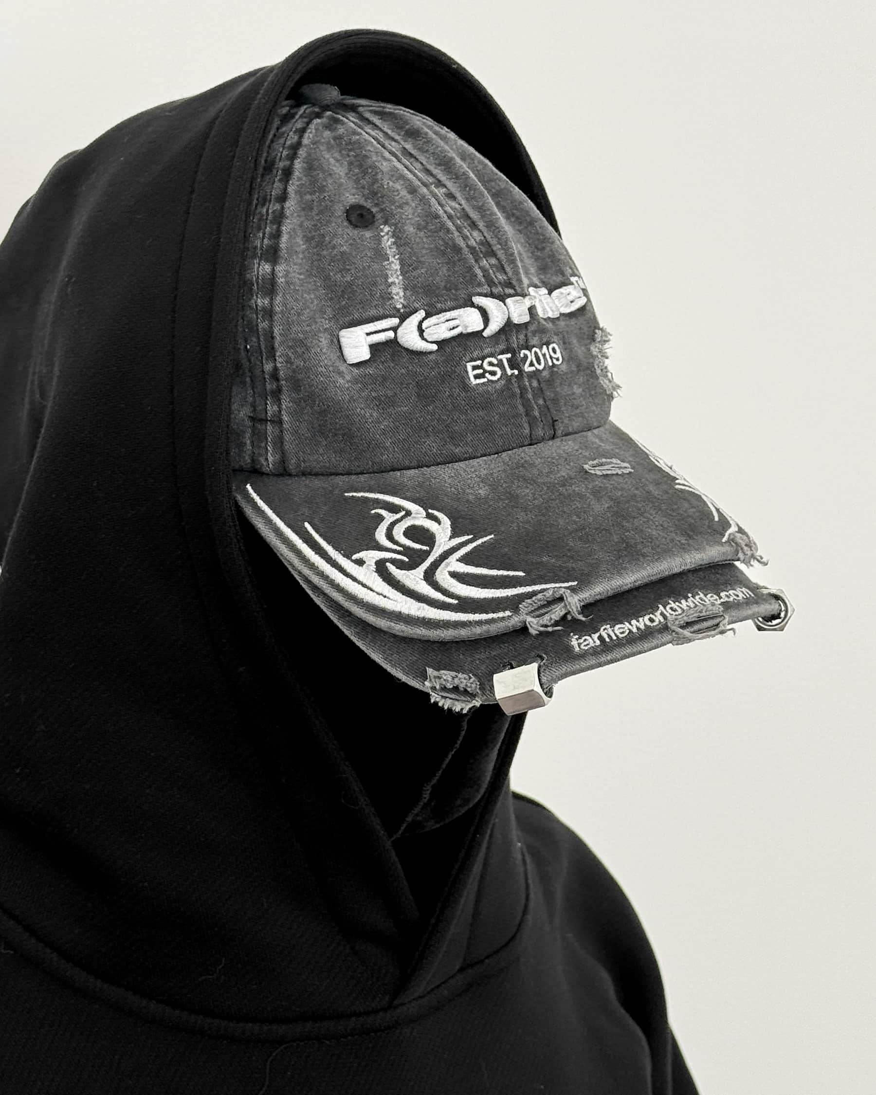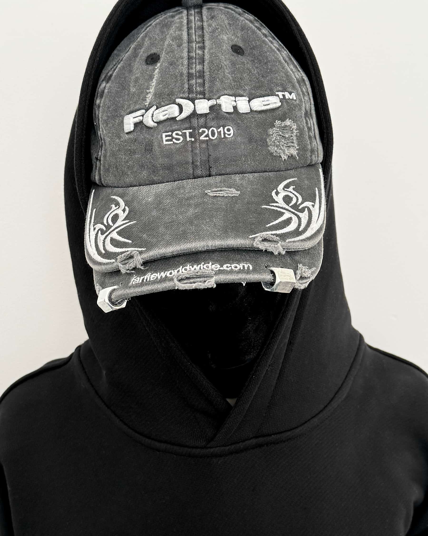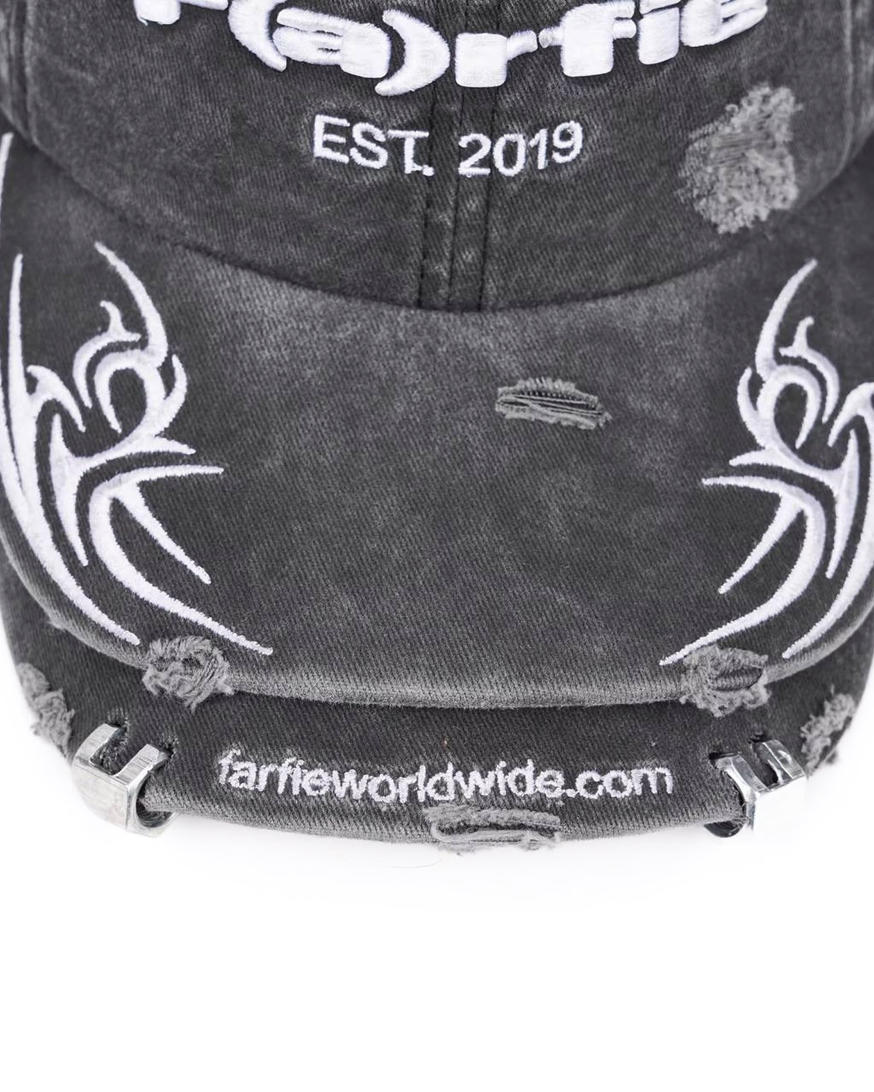Кепка з зістареного сірого деніму з потертостями та рваними елементами, 3D вишивка логотипу, подвійний козирок і справжні болти. М'яка та зручна модель з підкладкою та застібкою, що дає можливість регулювати розмір.