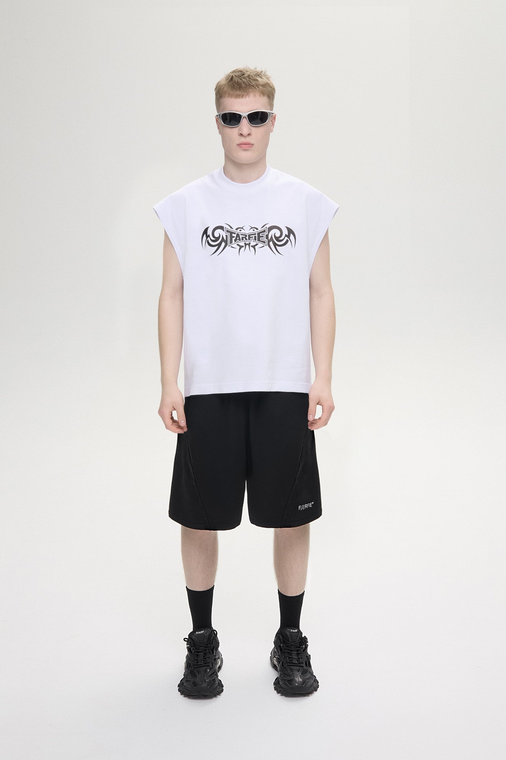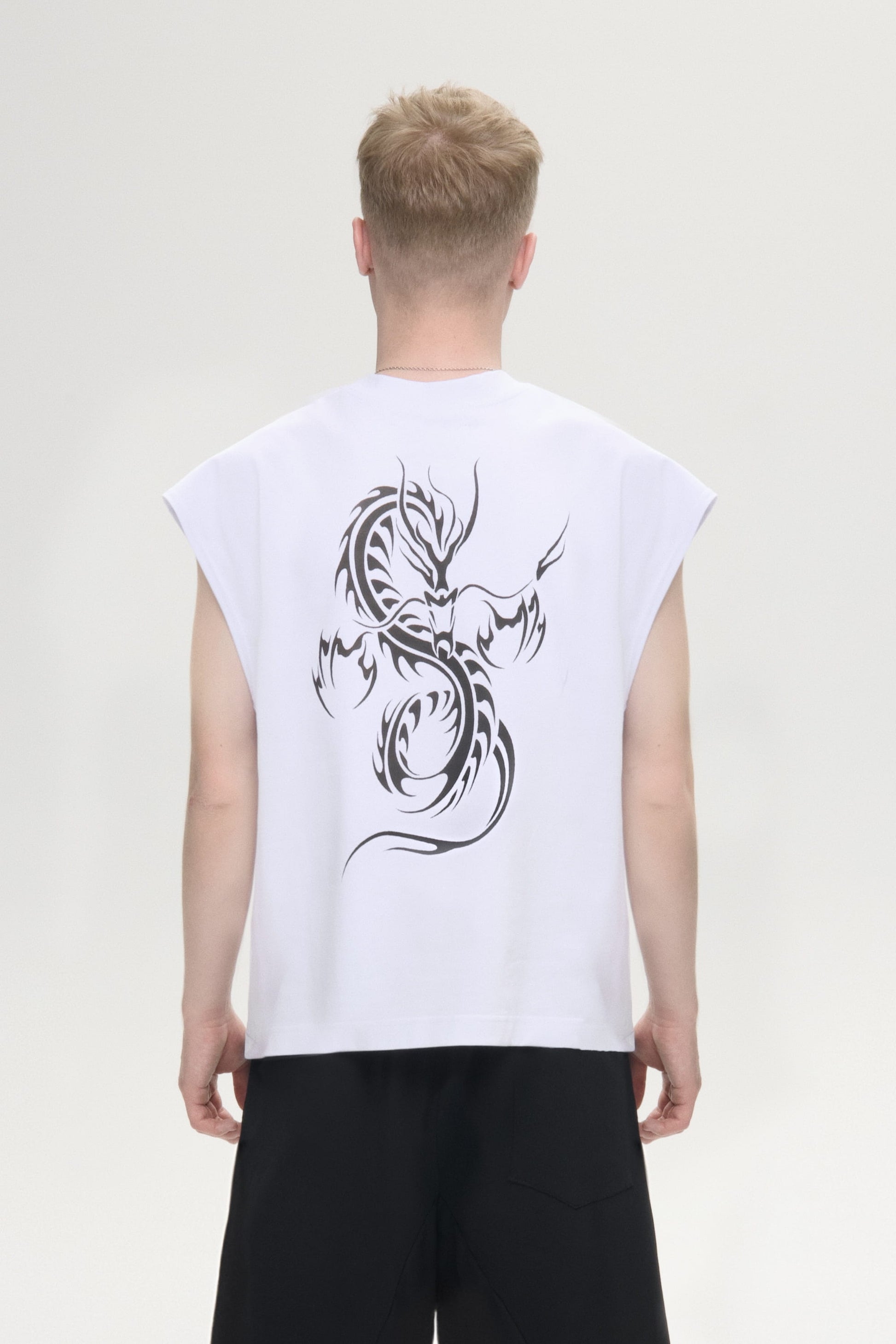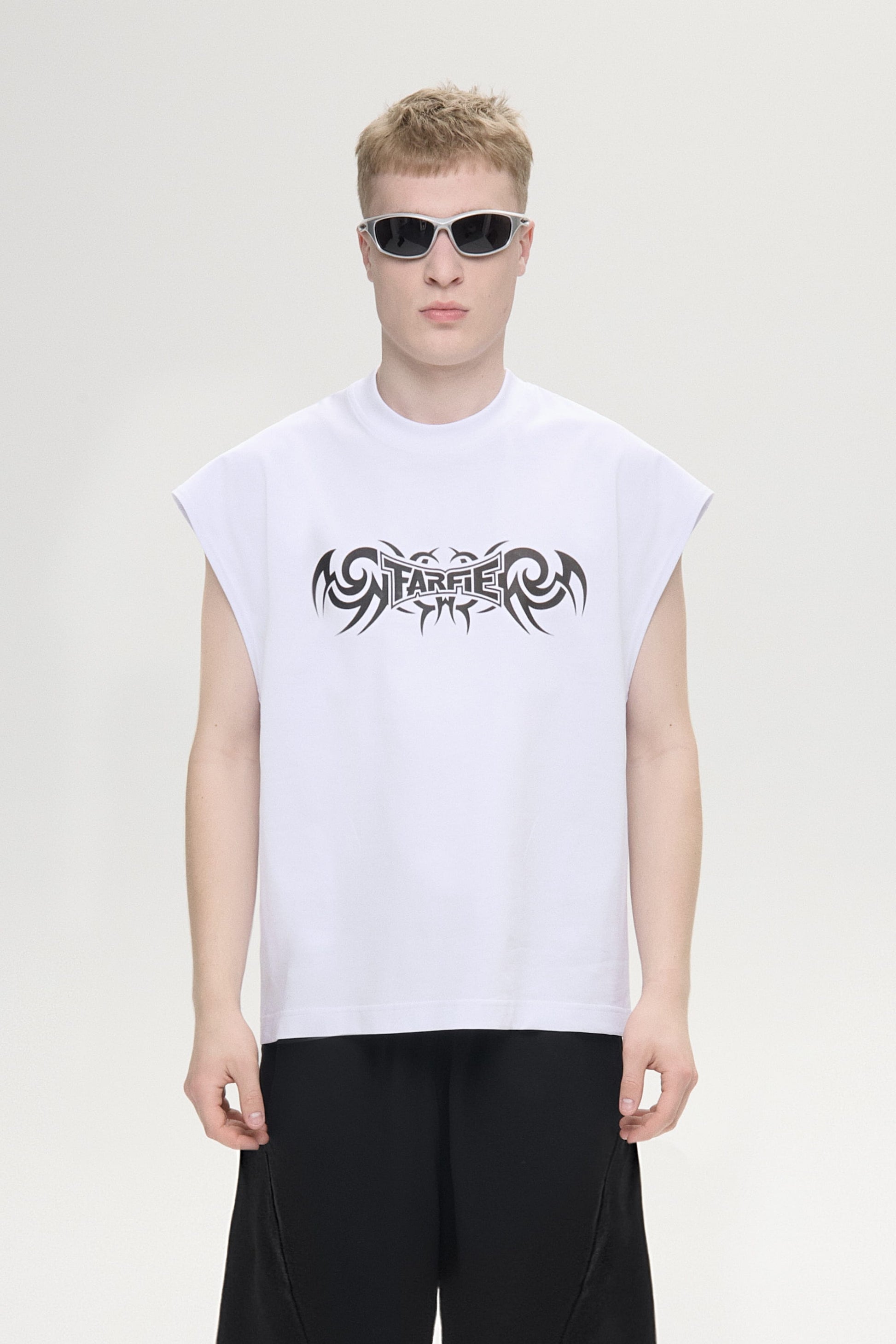 Майка свободного кроя, изготовленная из хлопчатобумажной ткани 250GSM. С круглым вырезом горловины и принтом на груди и спине.