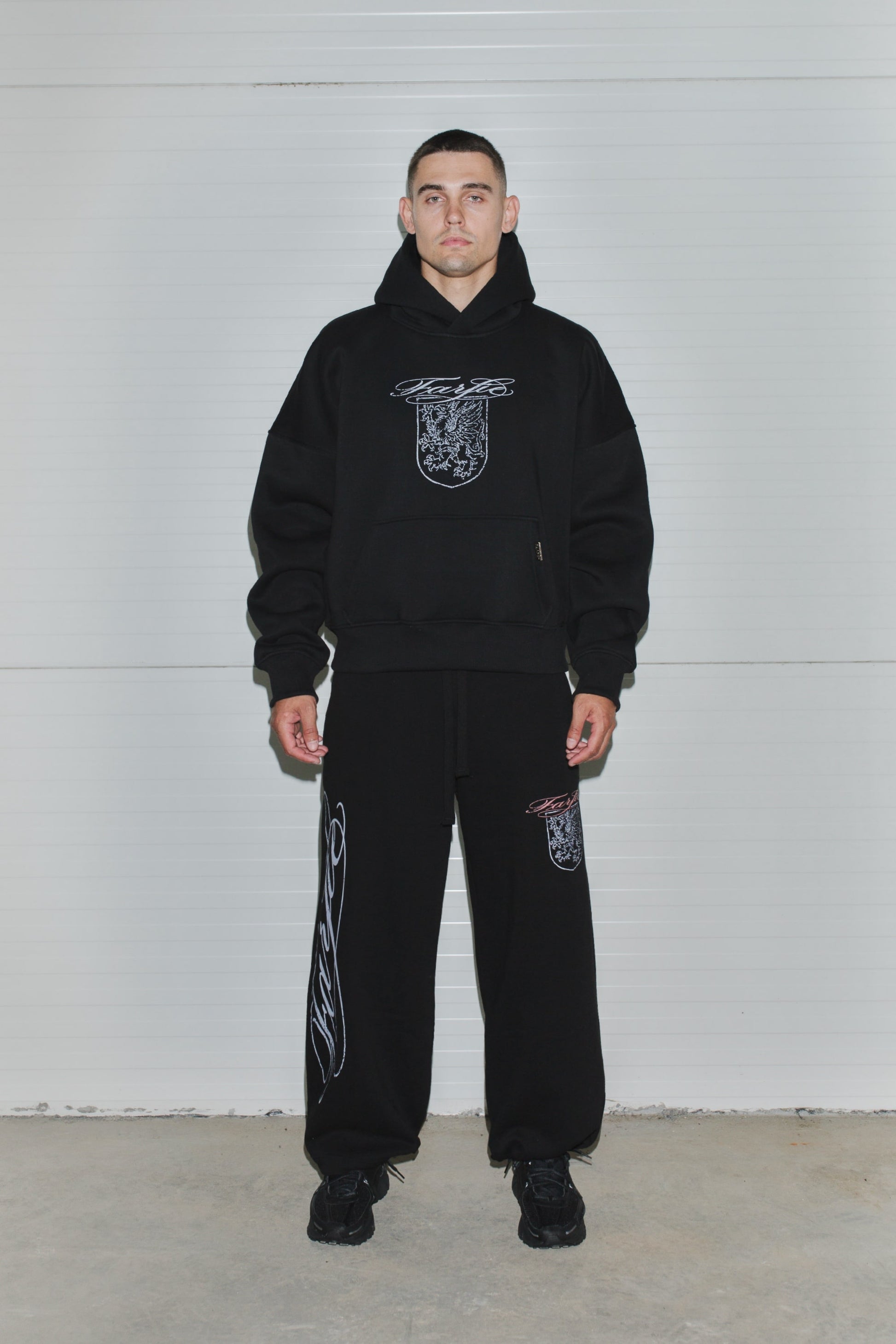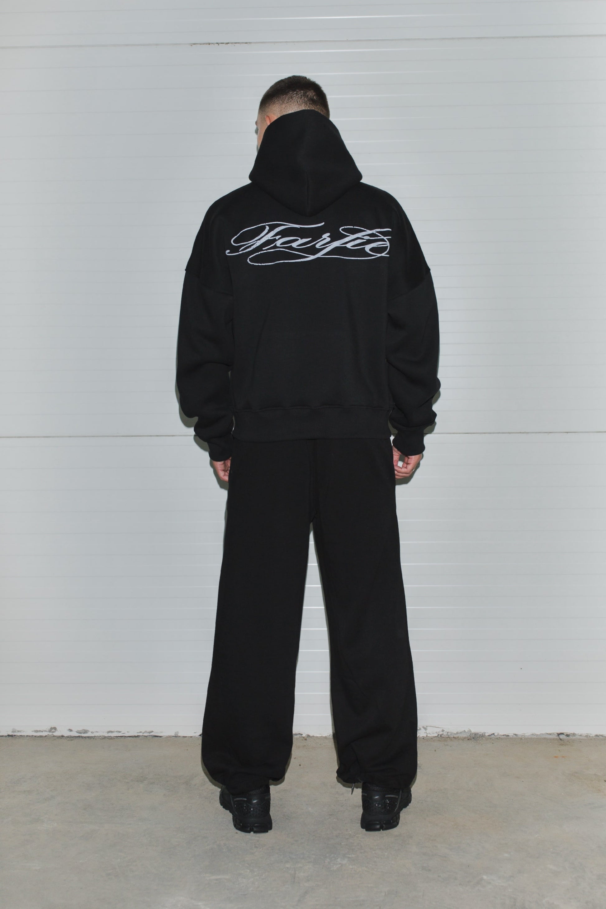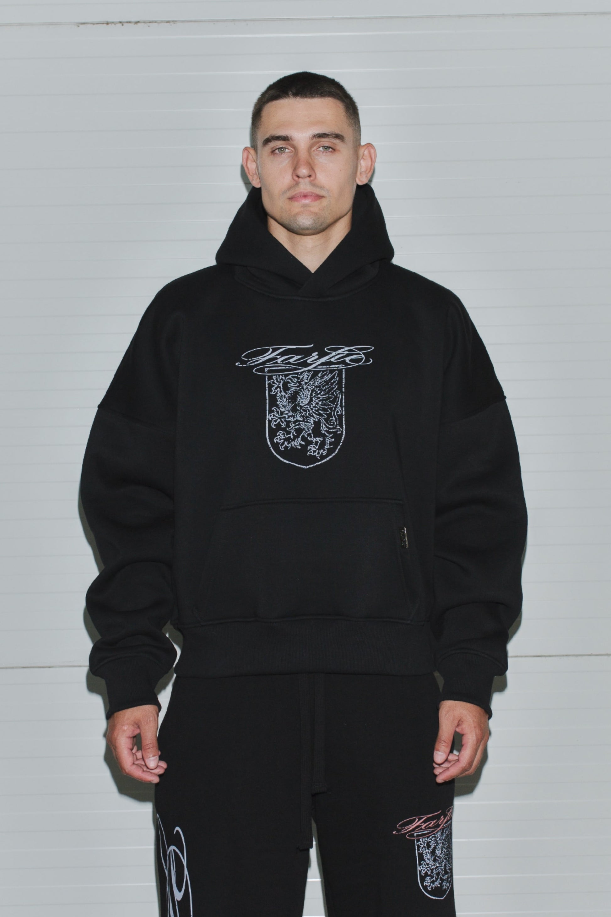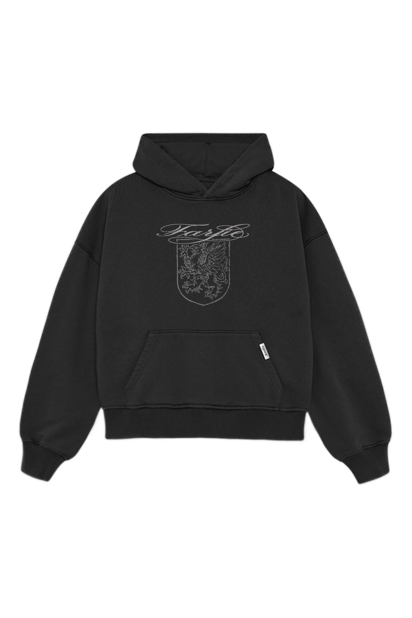 Худи свободного кроя, изготовленное из хлопчатобумажной ткани 380GSM. С объемным капюшоном, без карманов и принтом на груди.