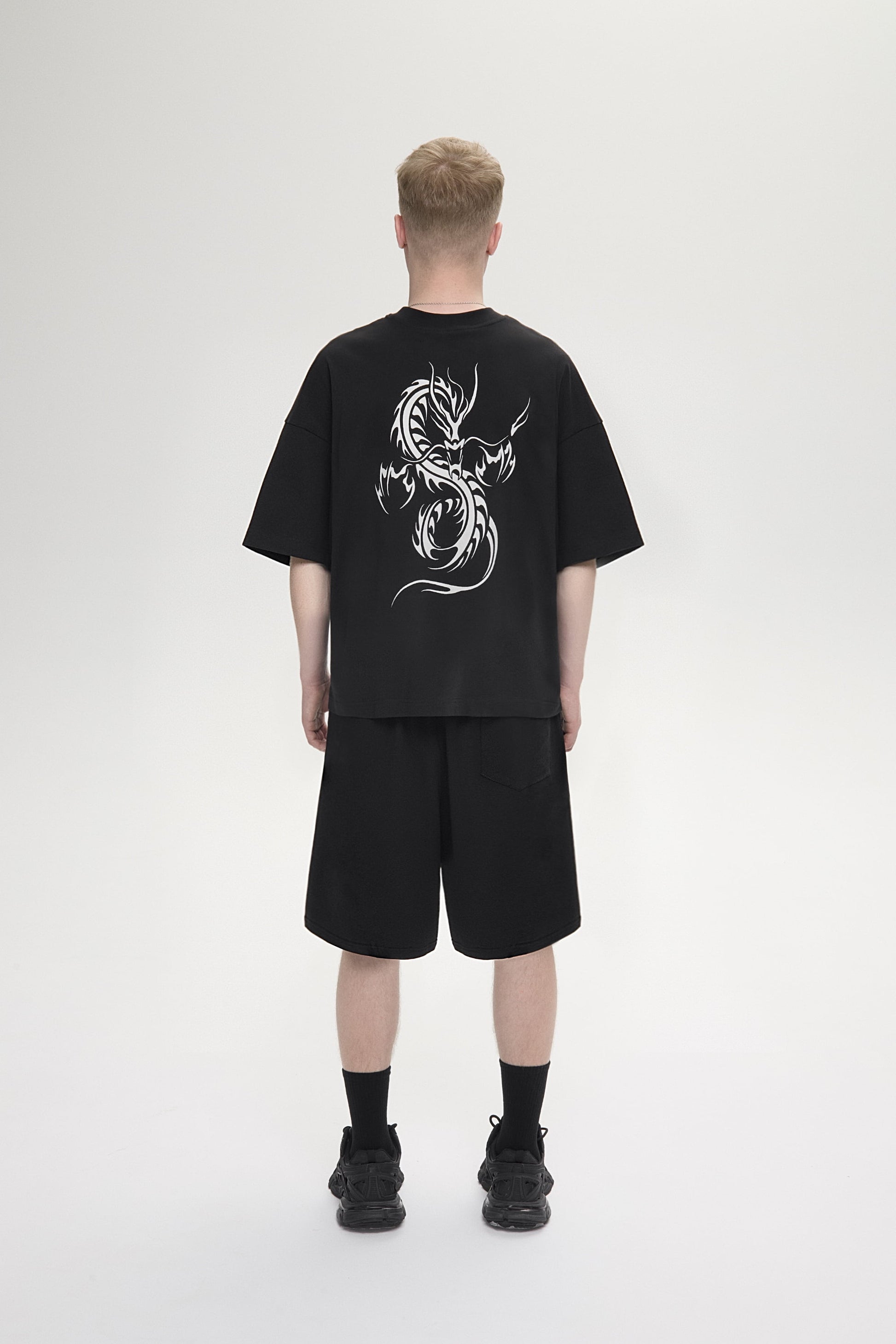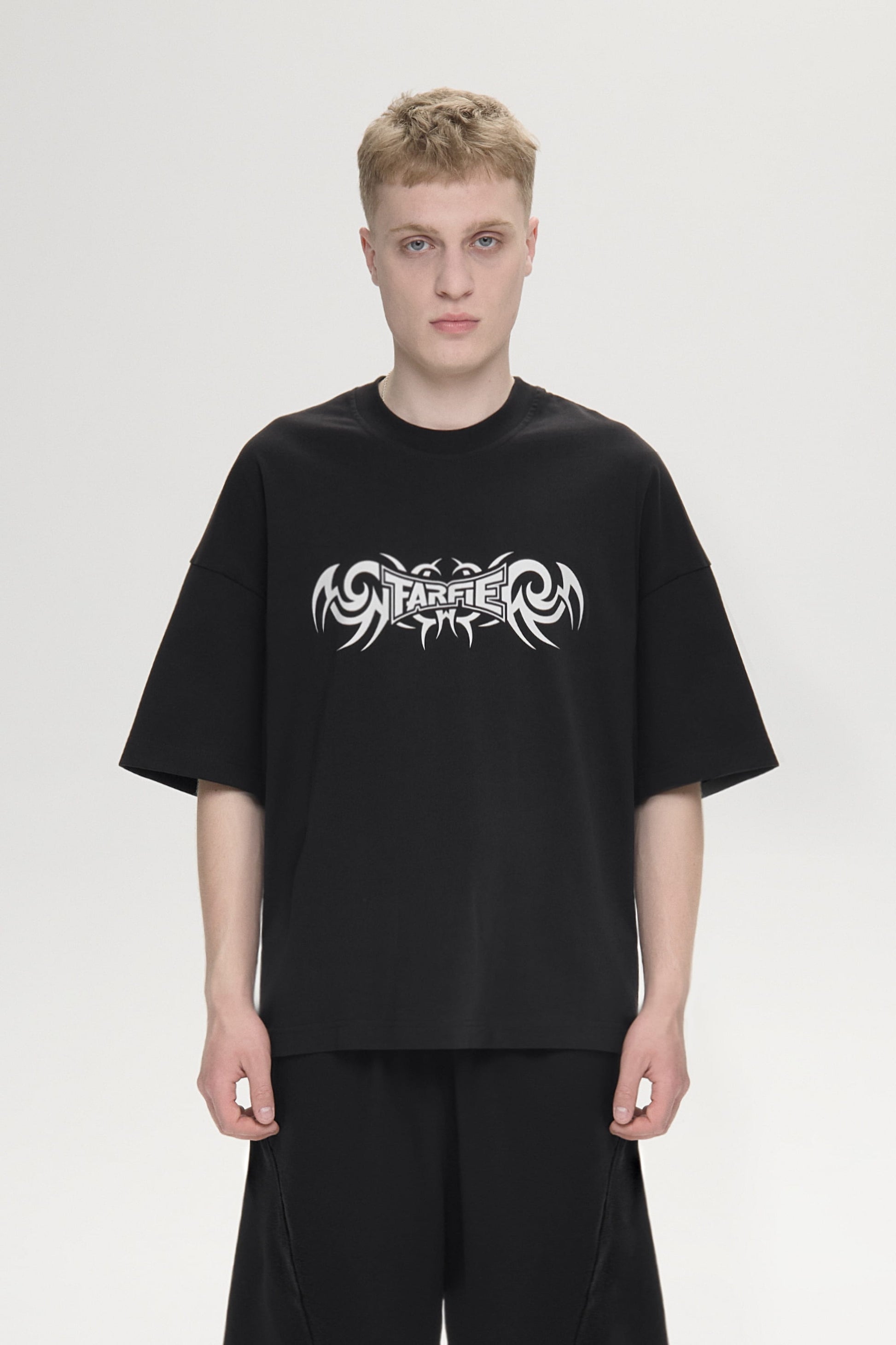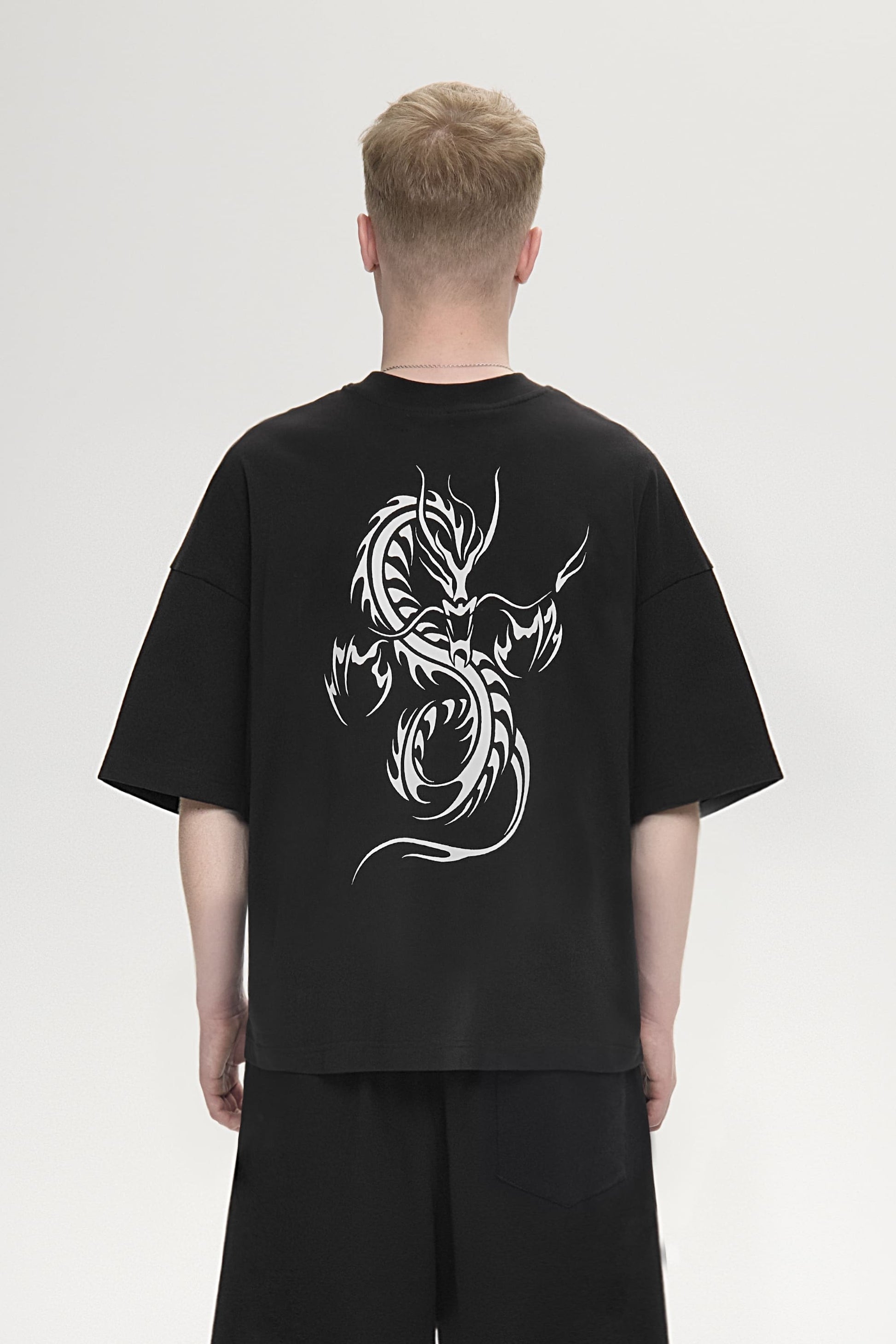 Футболка свободного кроя, изготовленная из хлопчатобумажной ткани 250GSM. С круглым вырезом горловины и принтом на груди и на спине.
