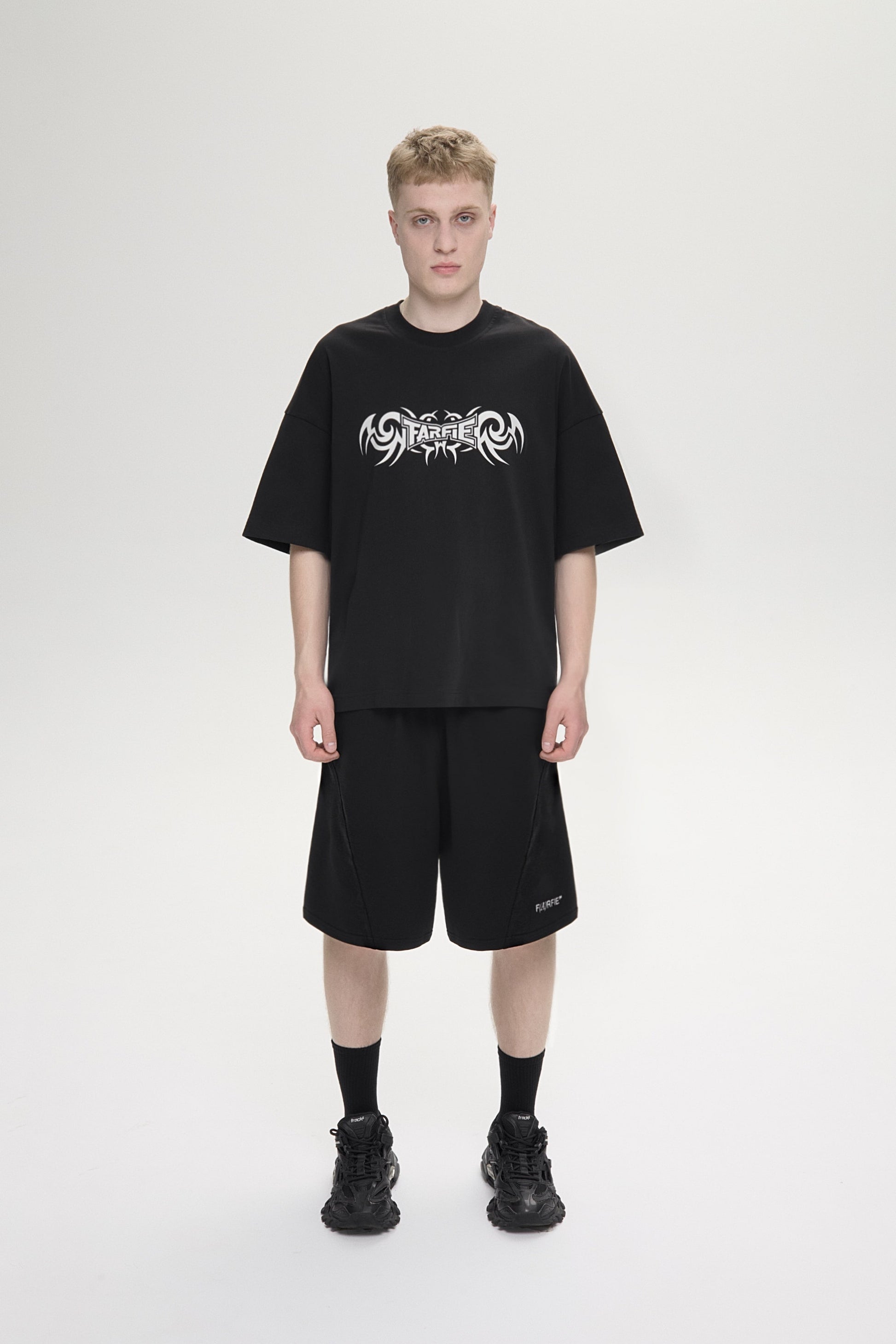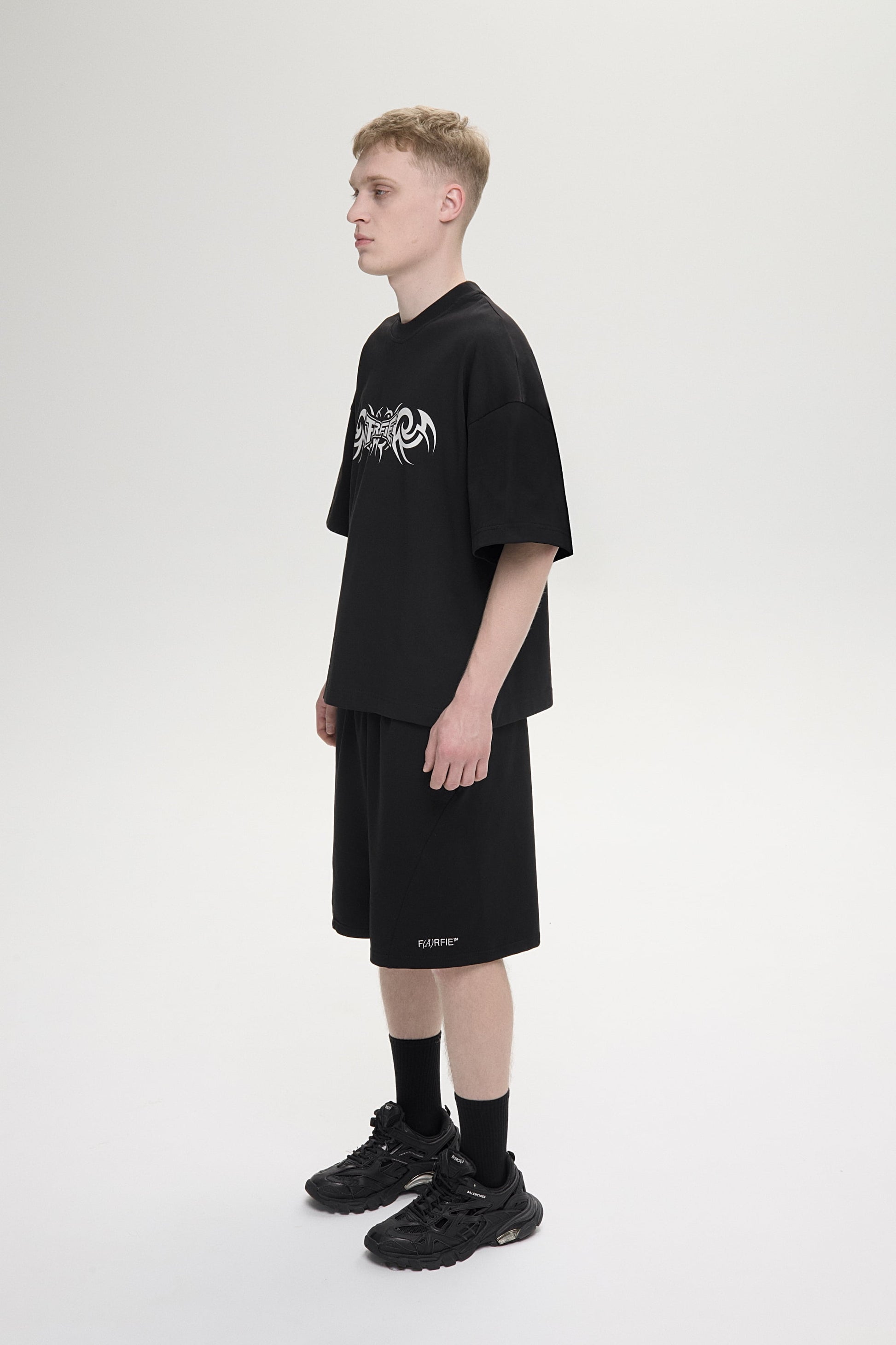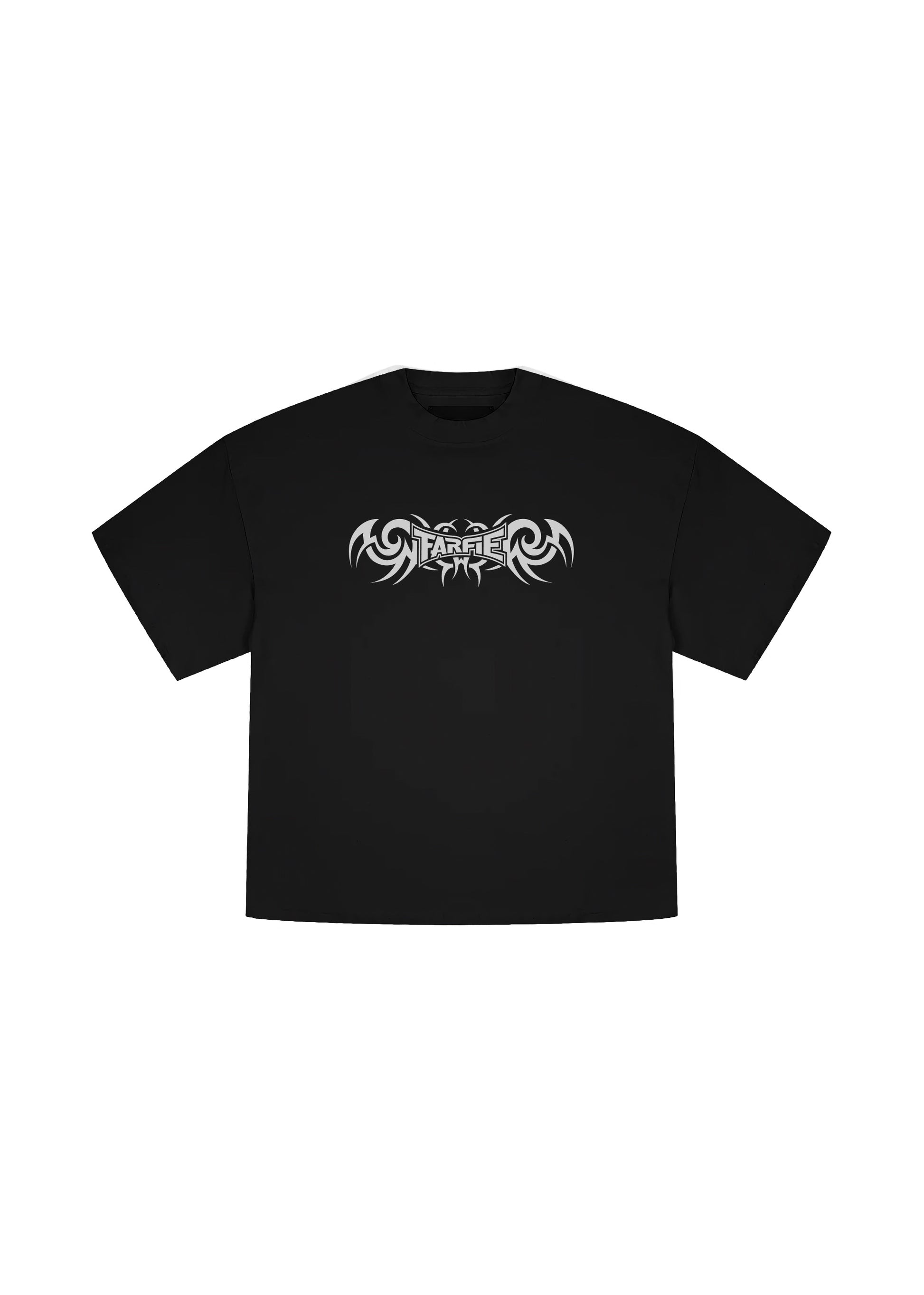 Футболка свободного кроя, изготовленная из хлопчатобумажной ткани 250GSM. С круглым вырезом горловины и принтом на груди и на спине.