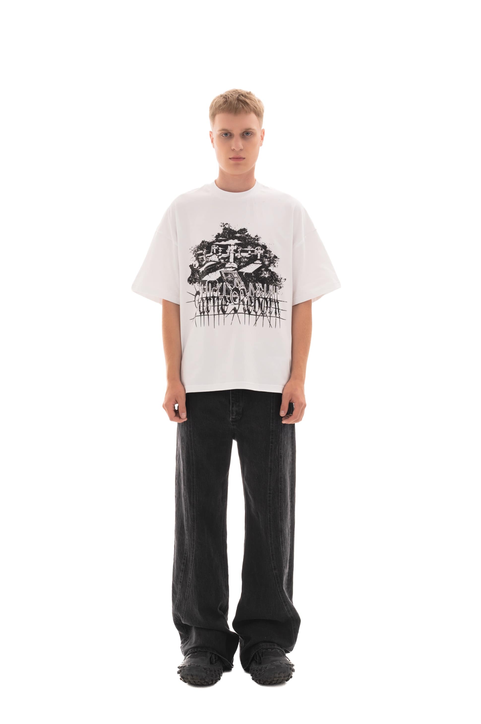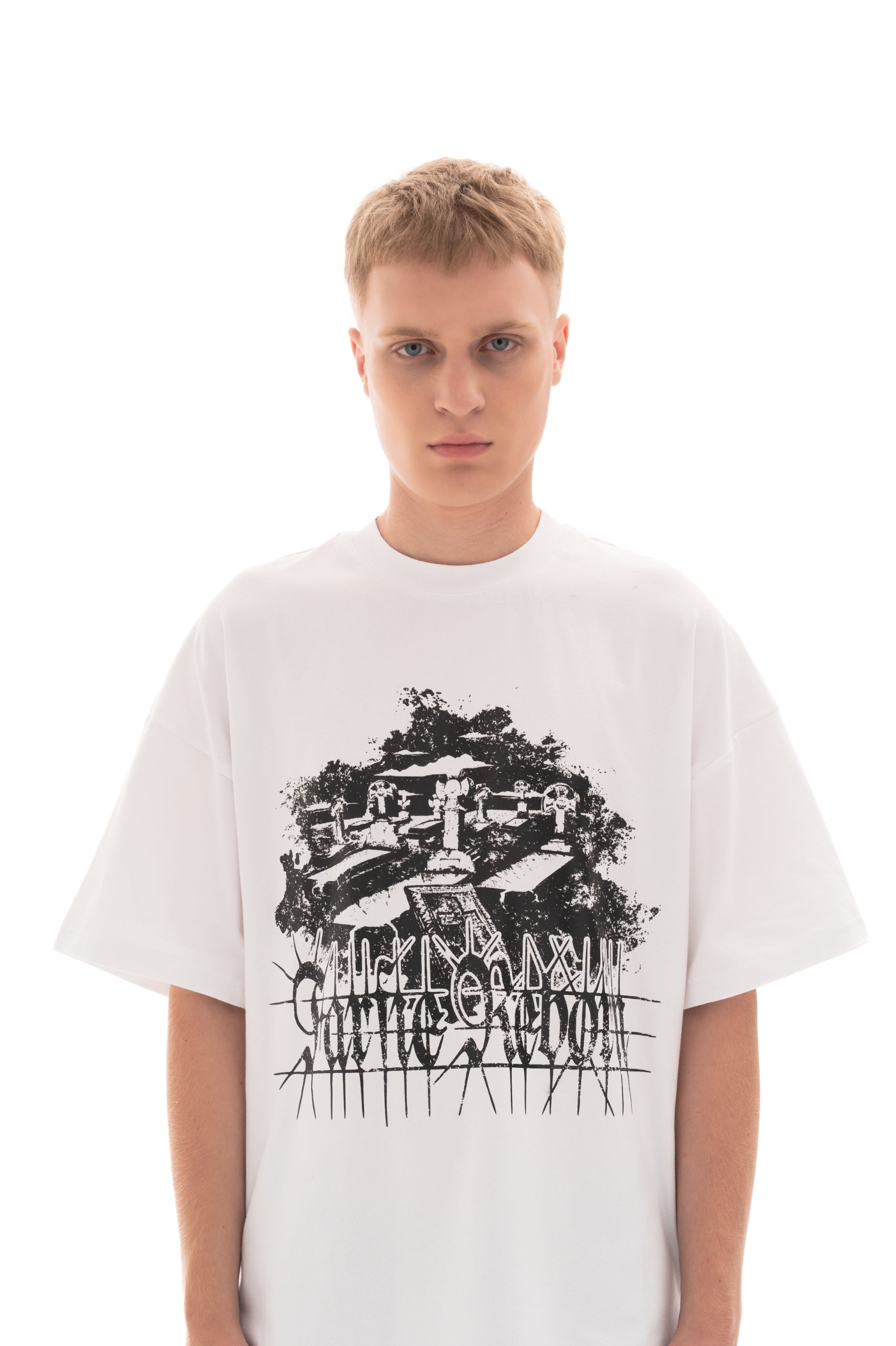 Футболка свободного кроя, изготовленная из хлопчатобумажной ткани 190GSM. С круглым вырезом горловины и принтом на груди.