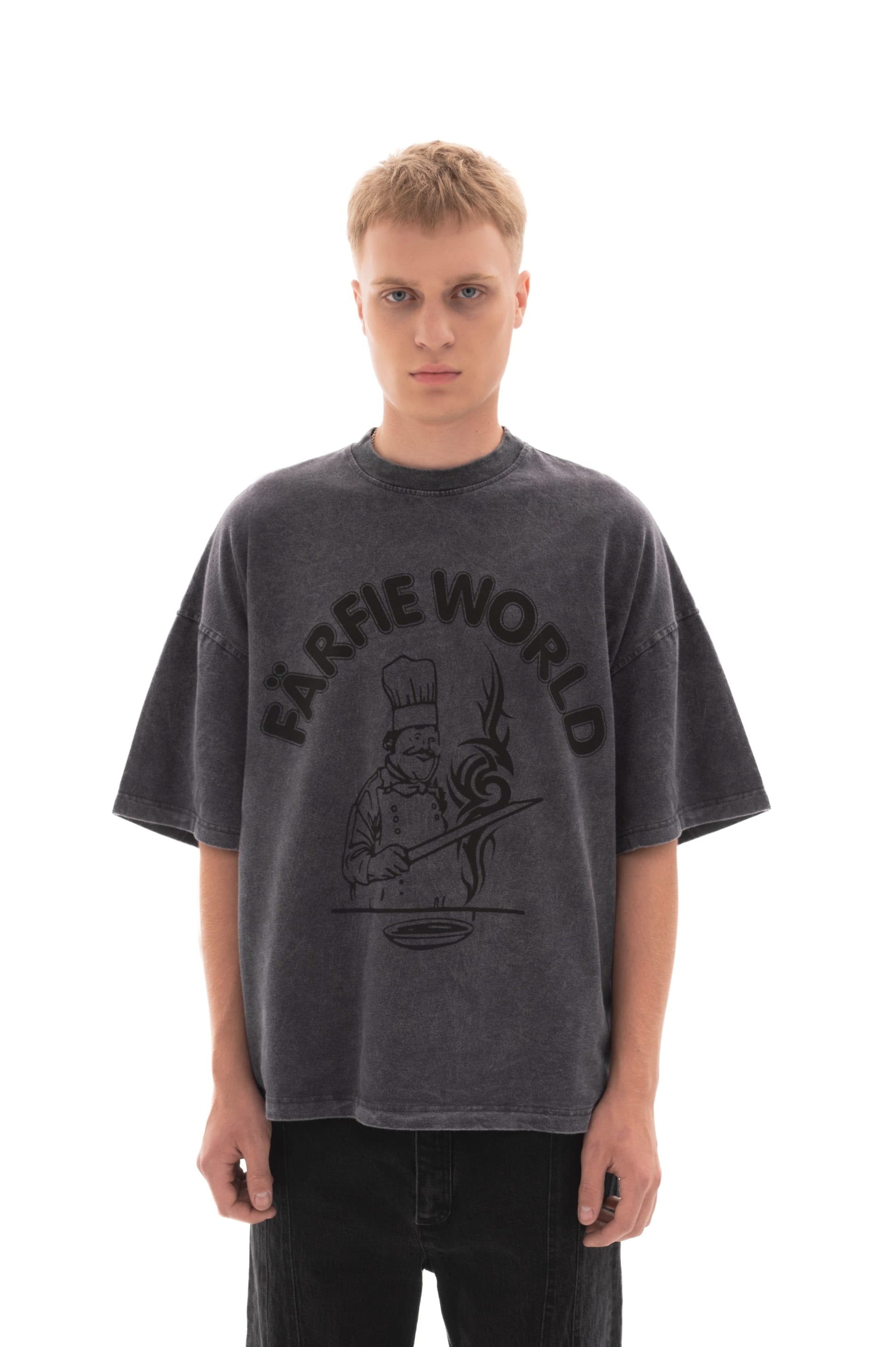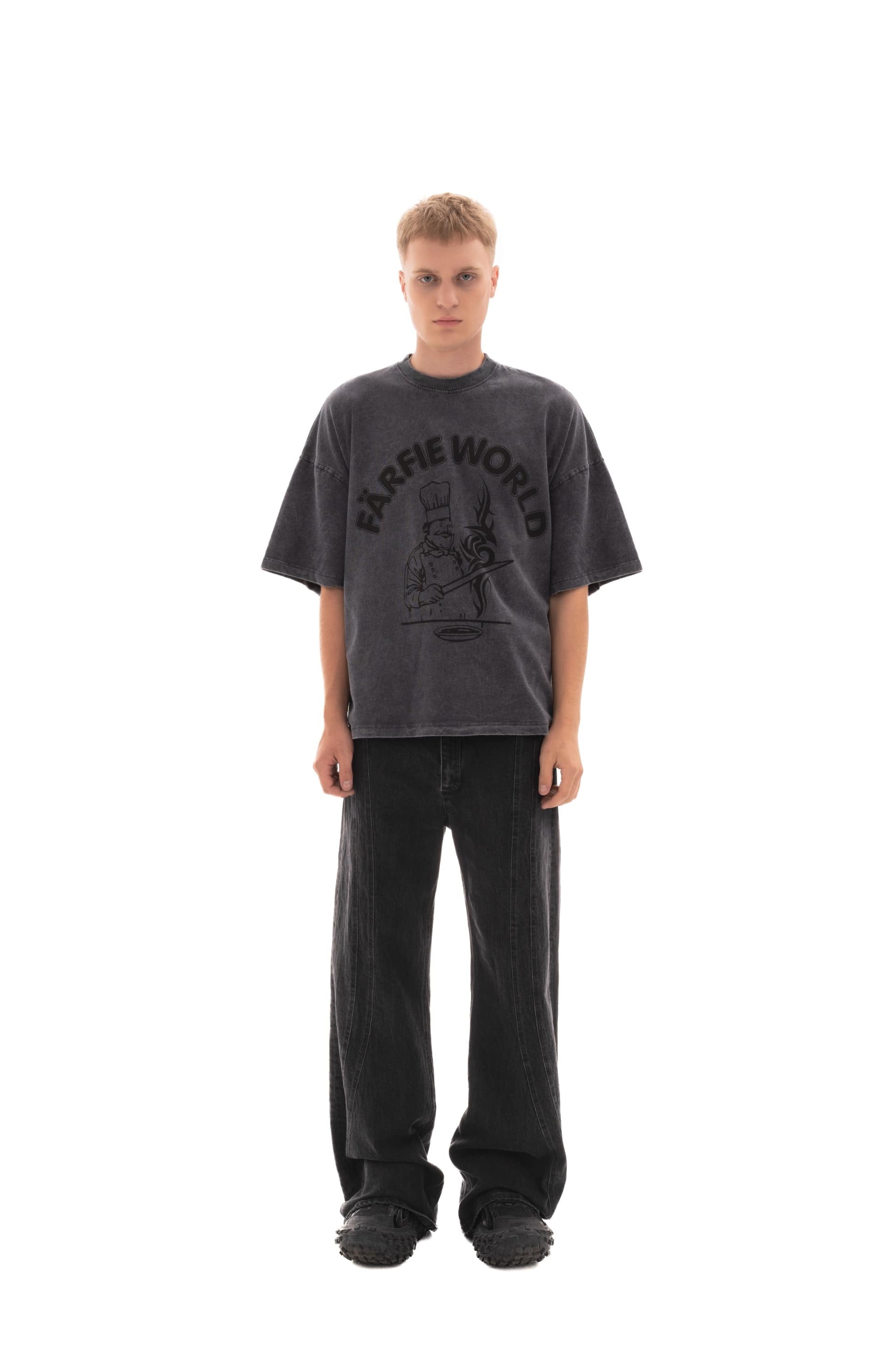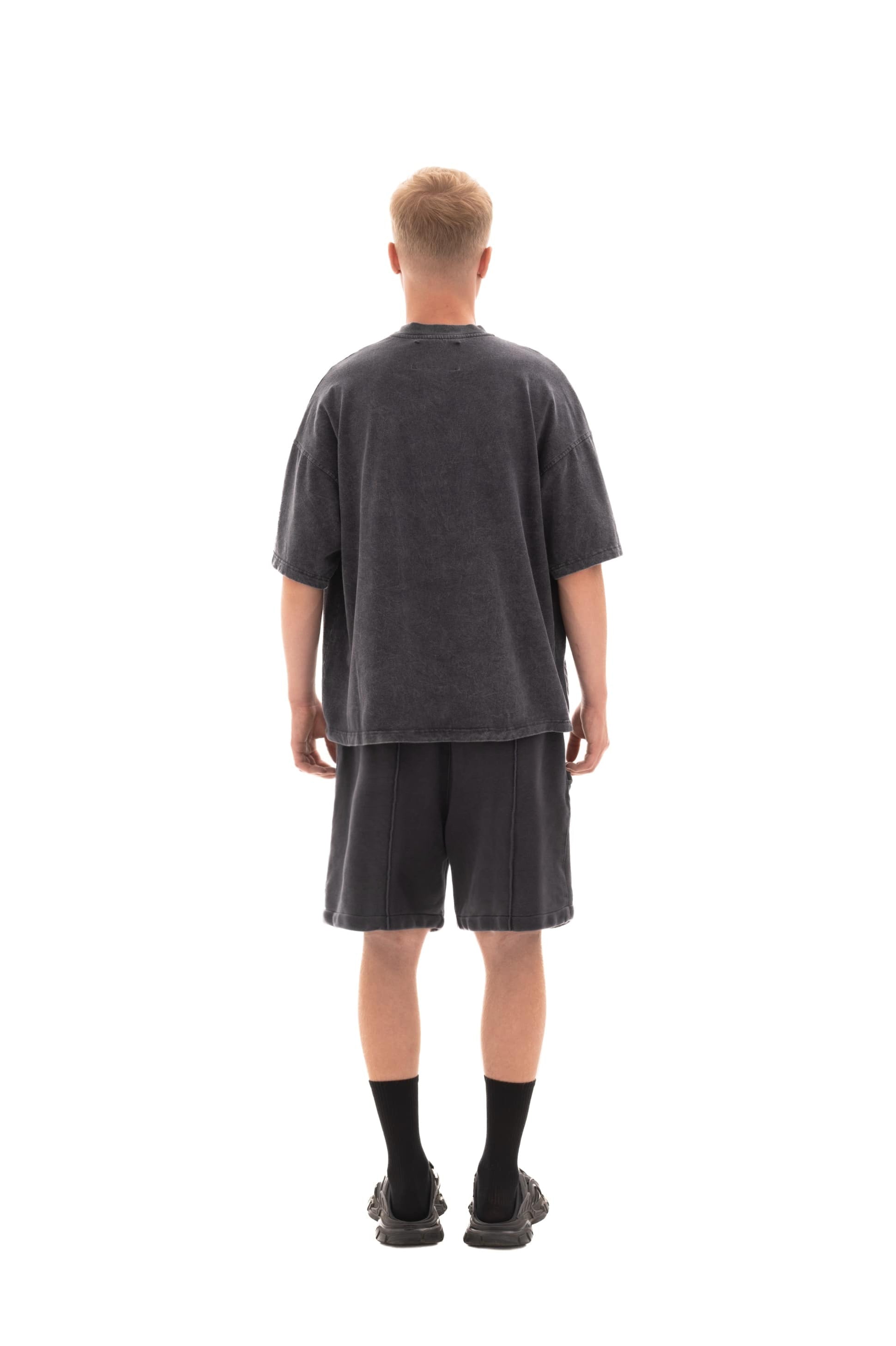 Футболка свободного кроя, изготовленная из хлопчатобумажной ткани 230GSM, с винтажным эффектом. С круглым вырезом горловины и принтом на груди.