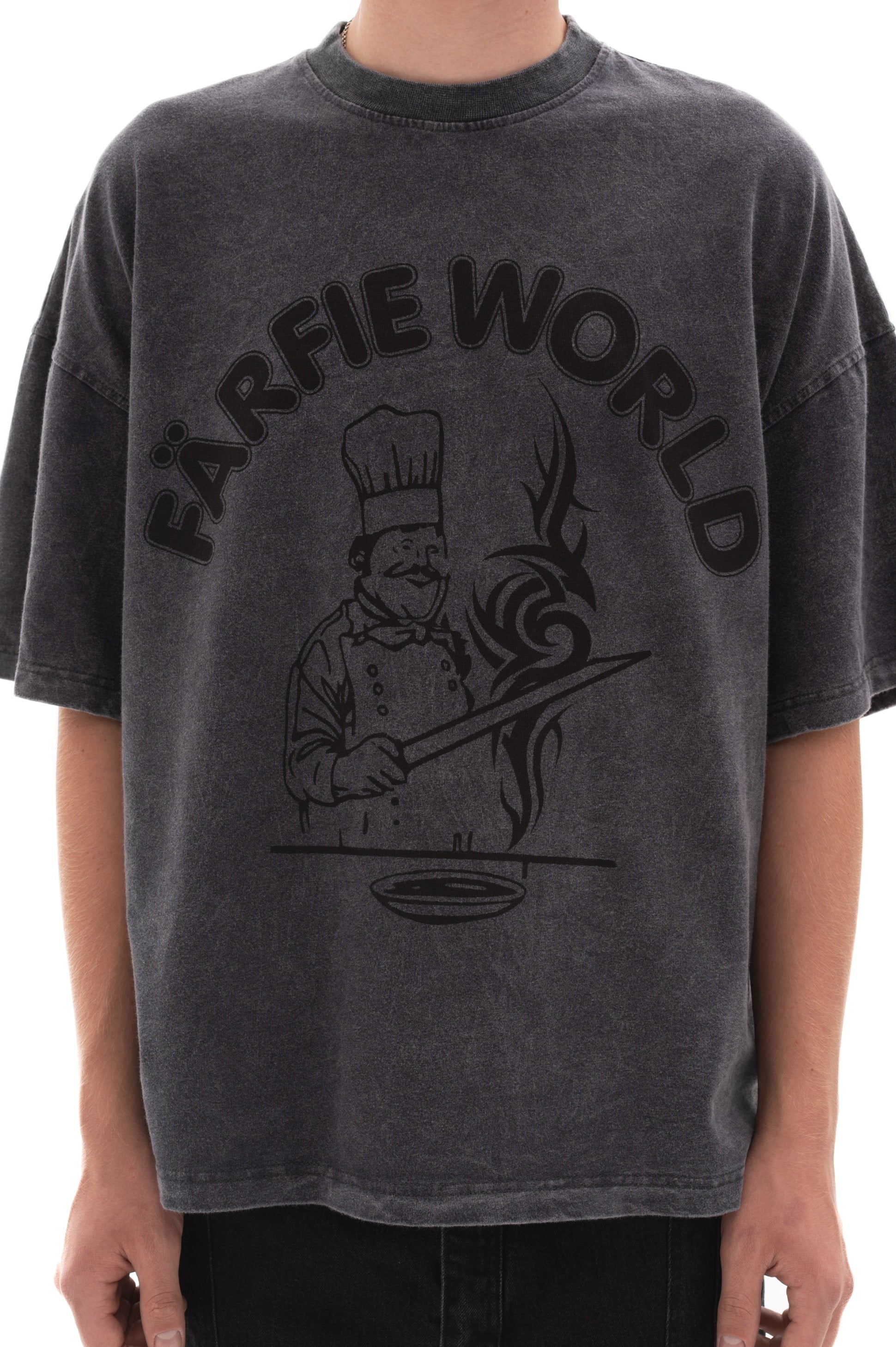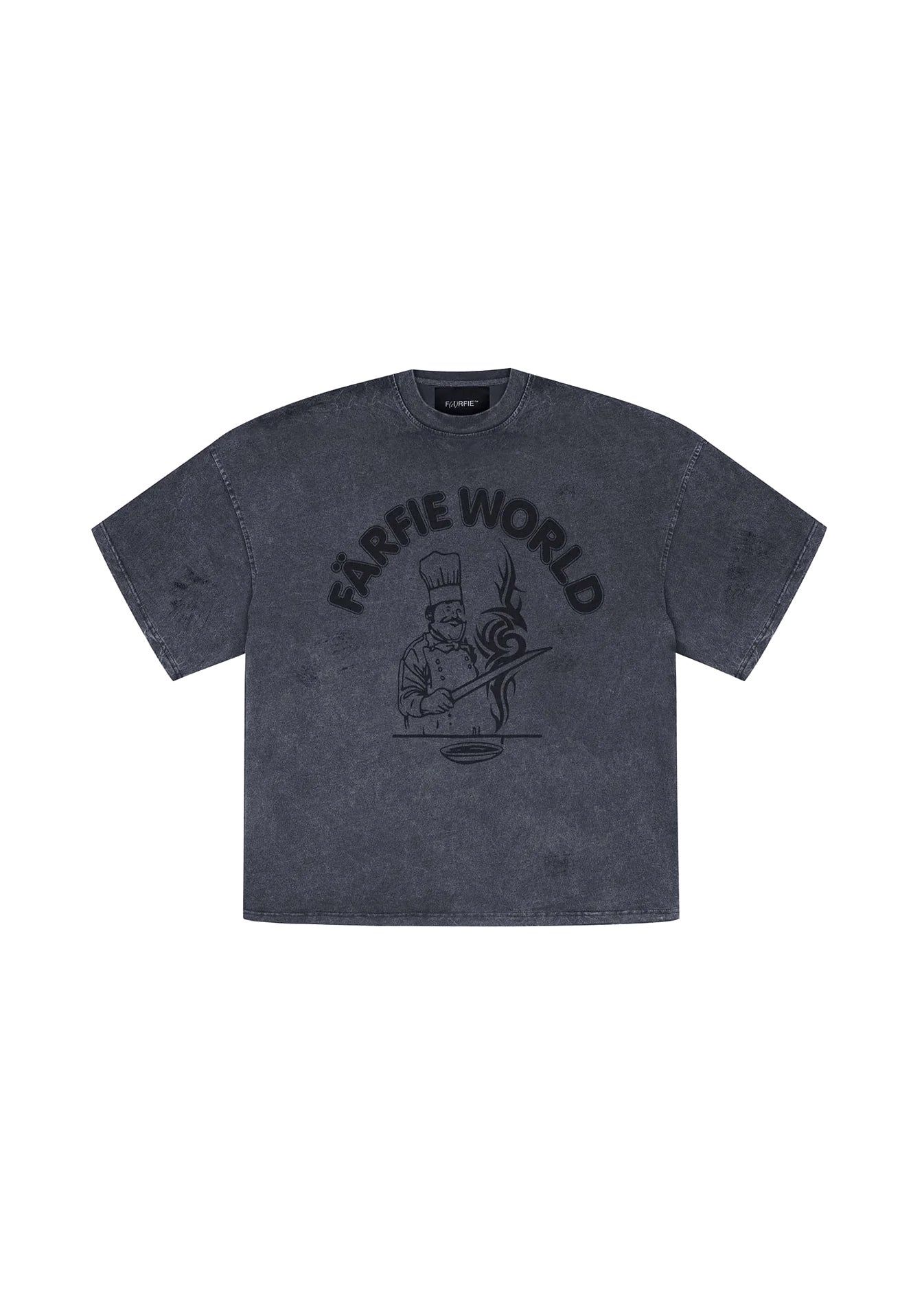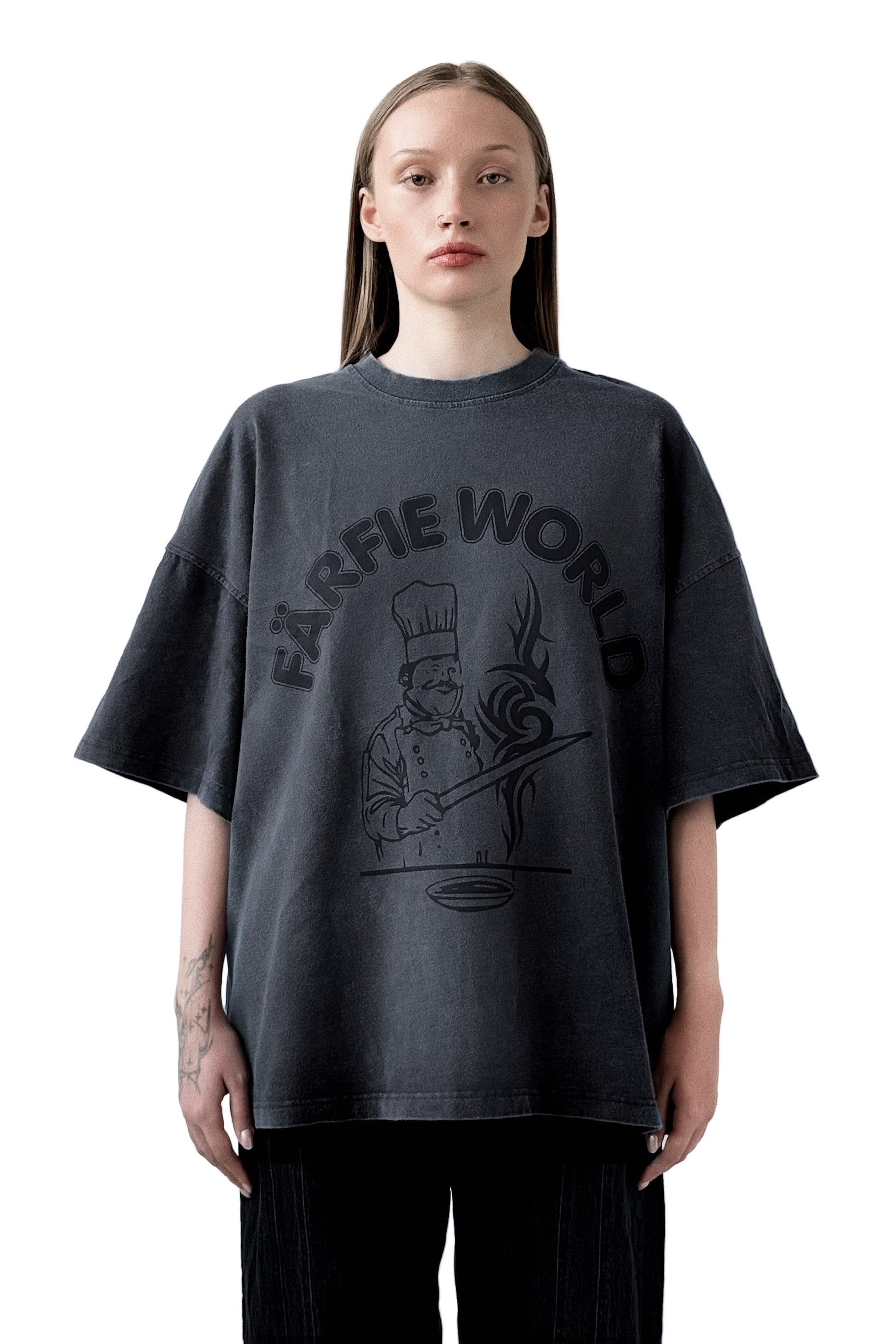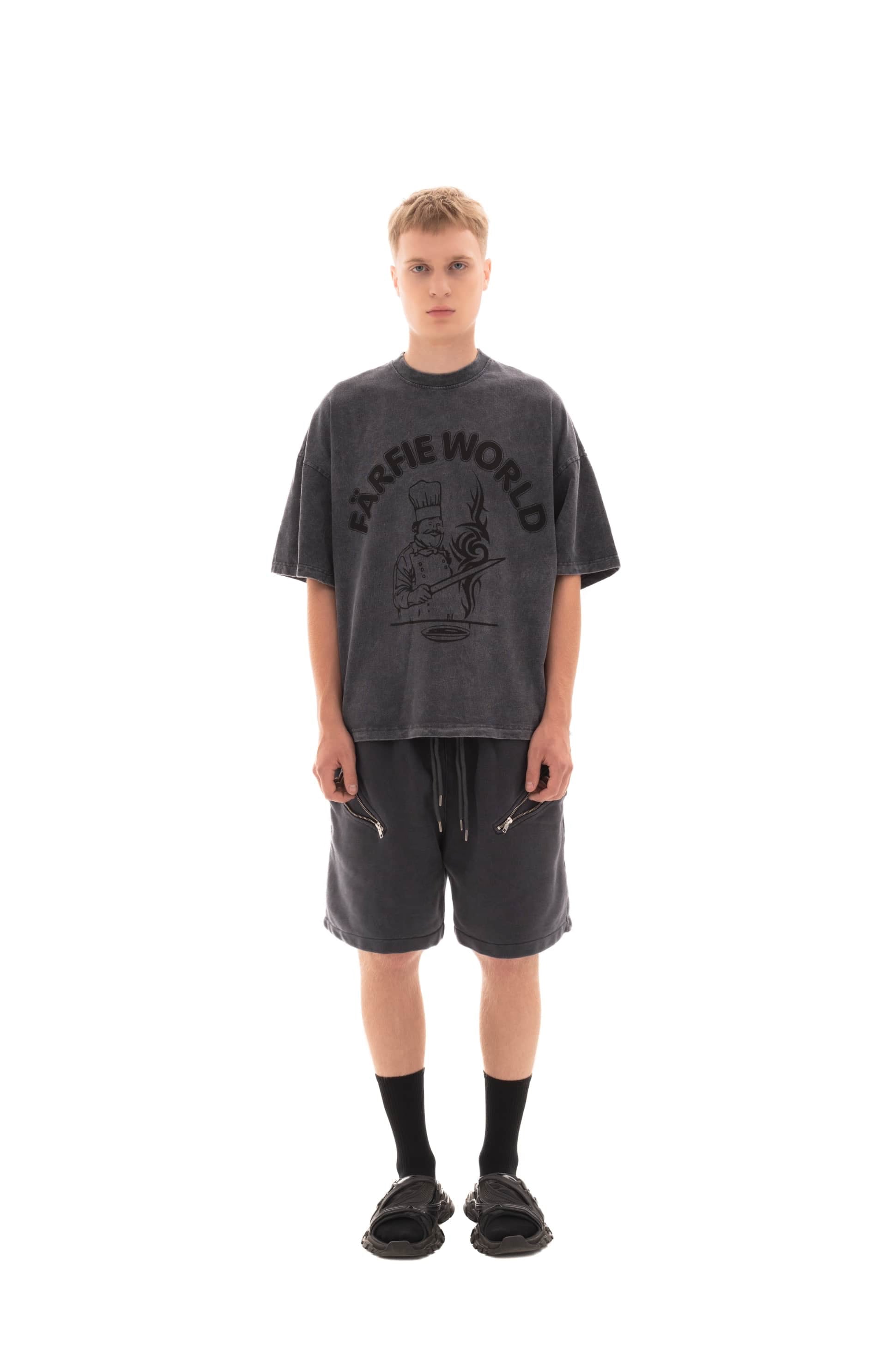 Футболка свободного кроя, изготовленная из хлопчатобумажной ткани 230GSM, с винтажным эффектом. С круглым вырезом горловины и принтом на груди.