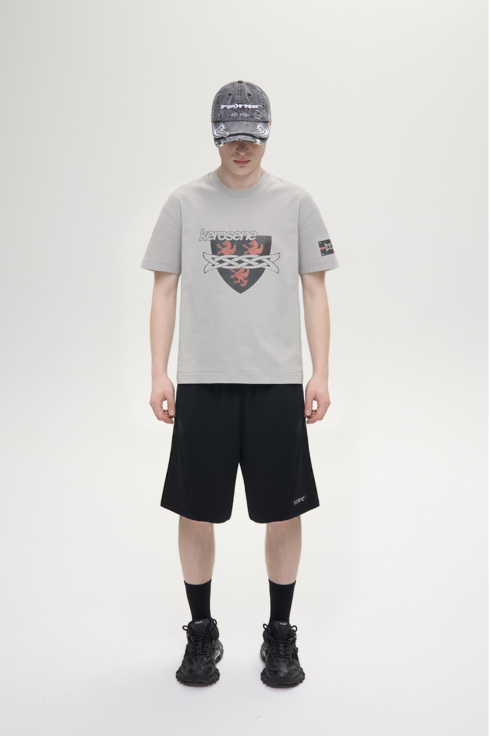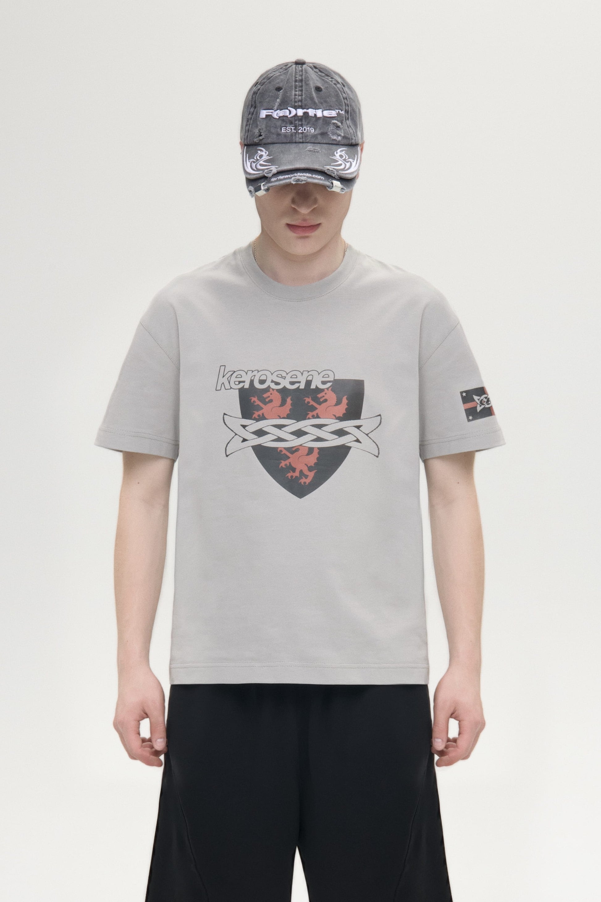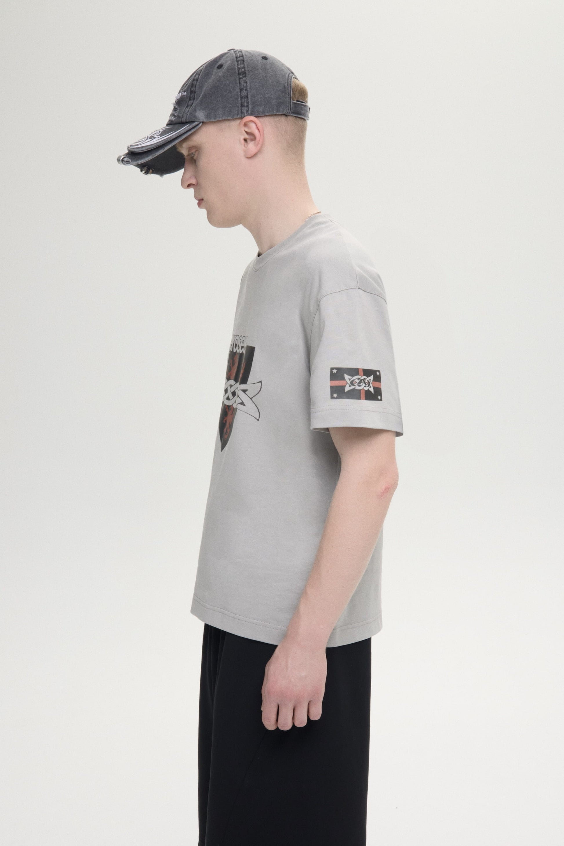 Футболка свободного кроя, изготовлена из хлопчатобумажной ткани 250GSM. С круглым вырезом горловины и принтом на груди и рукавах.