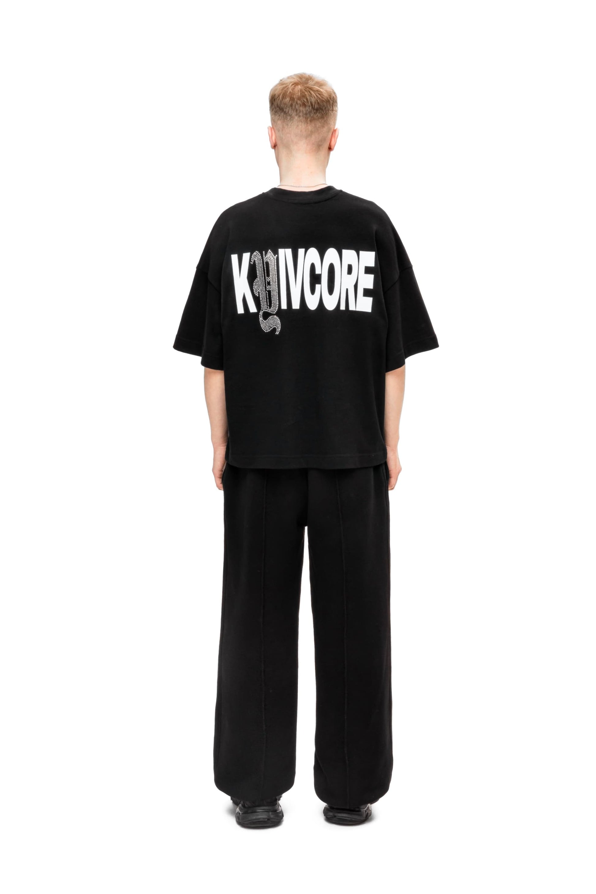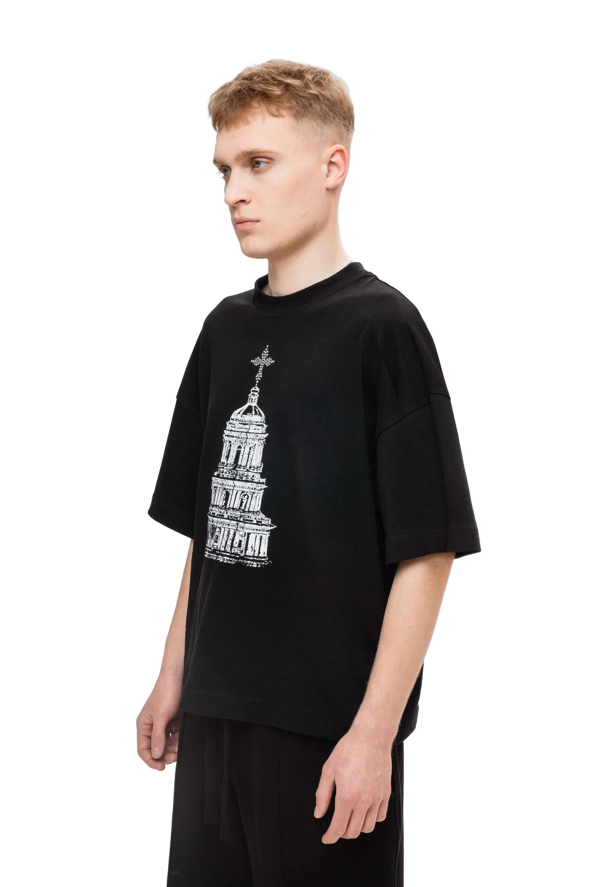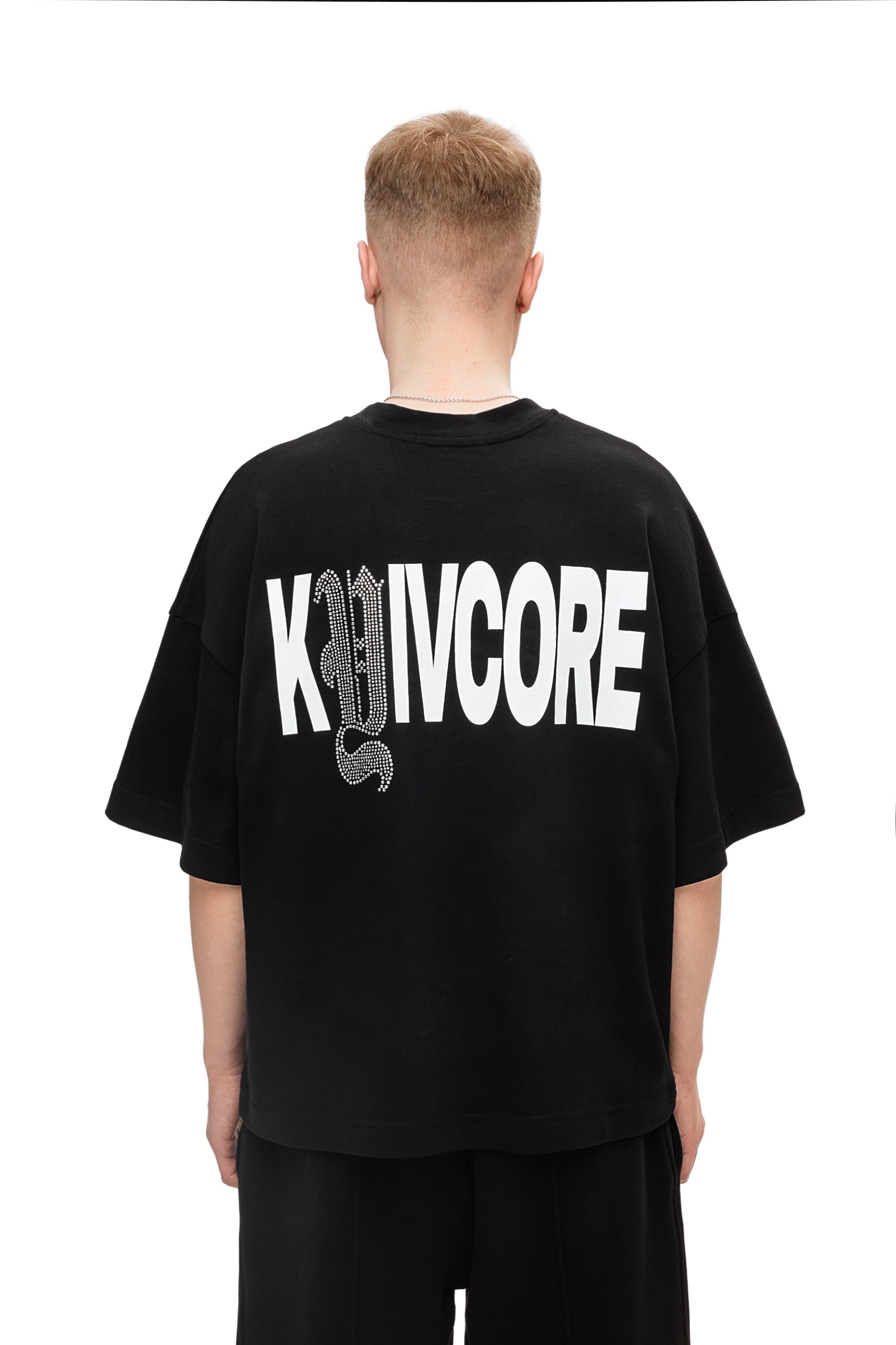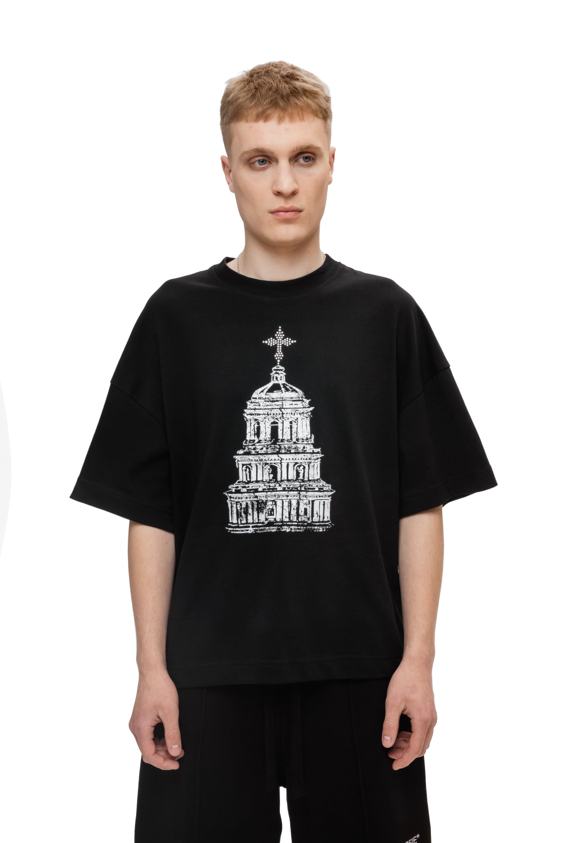 Футболка свободного кроя, изготовленная из хлопчатобумажной ткани 250GSM. С круглым вырезом горловины, принтом на груди, украшенной крестом аппликации страз и надписью на спине Kyivcore, выделенной буквой из страз.