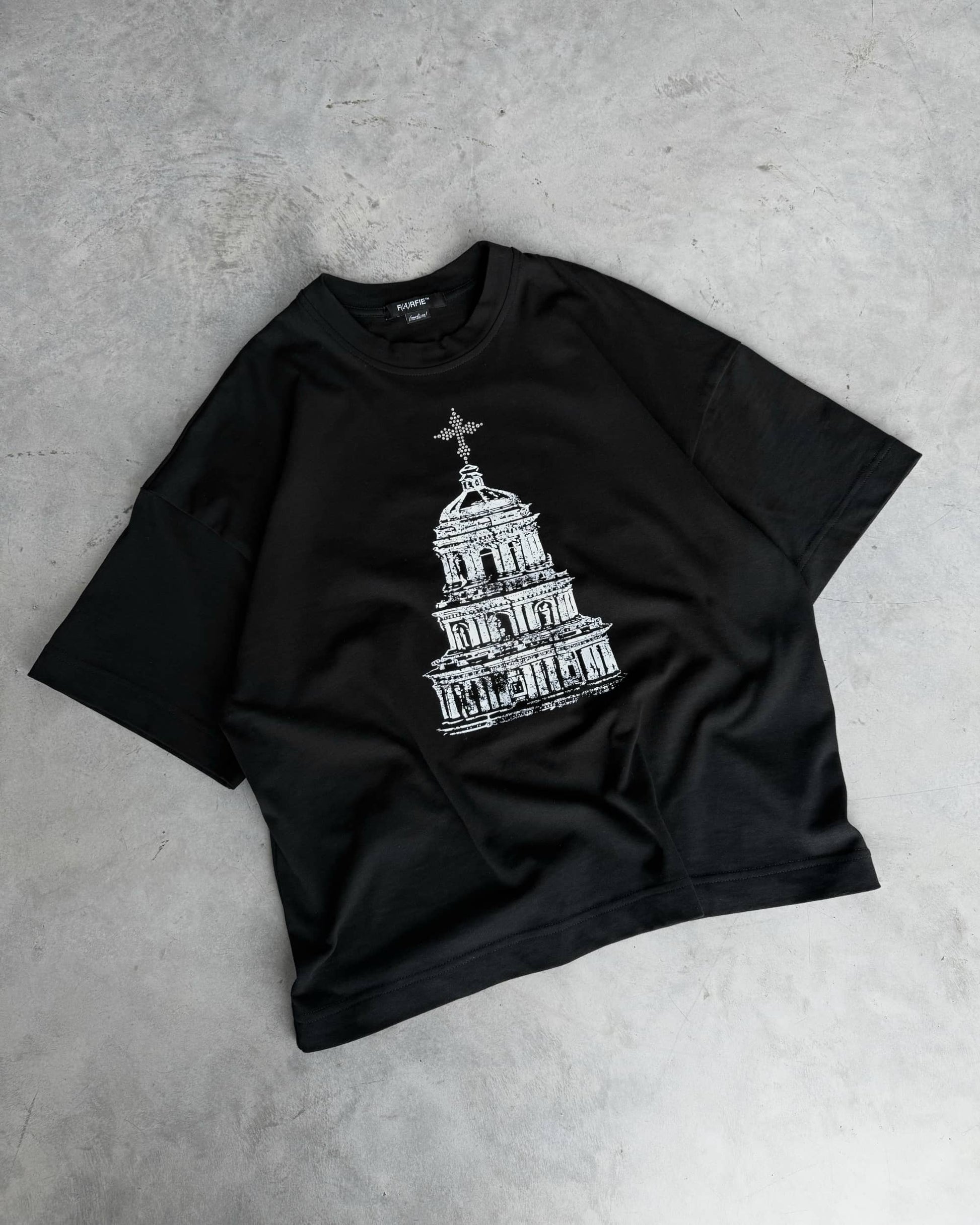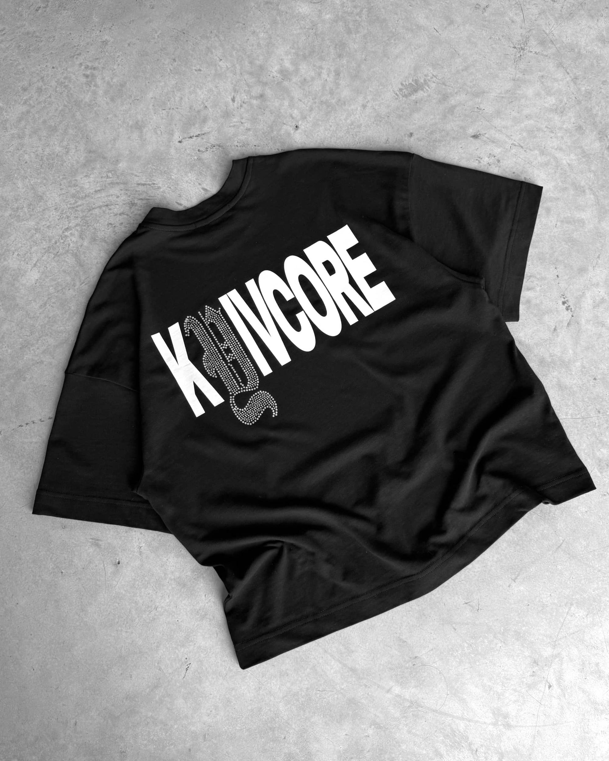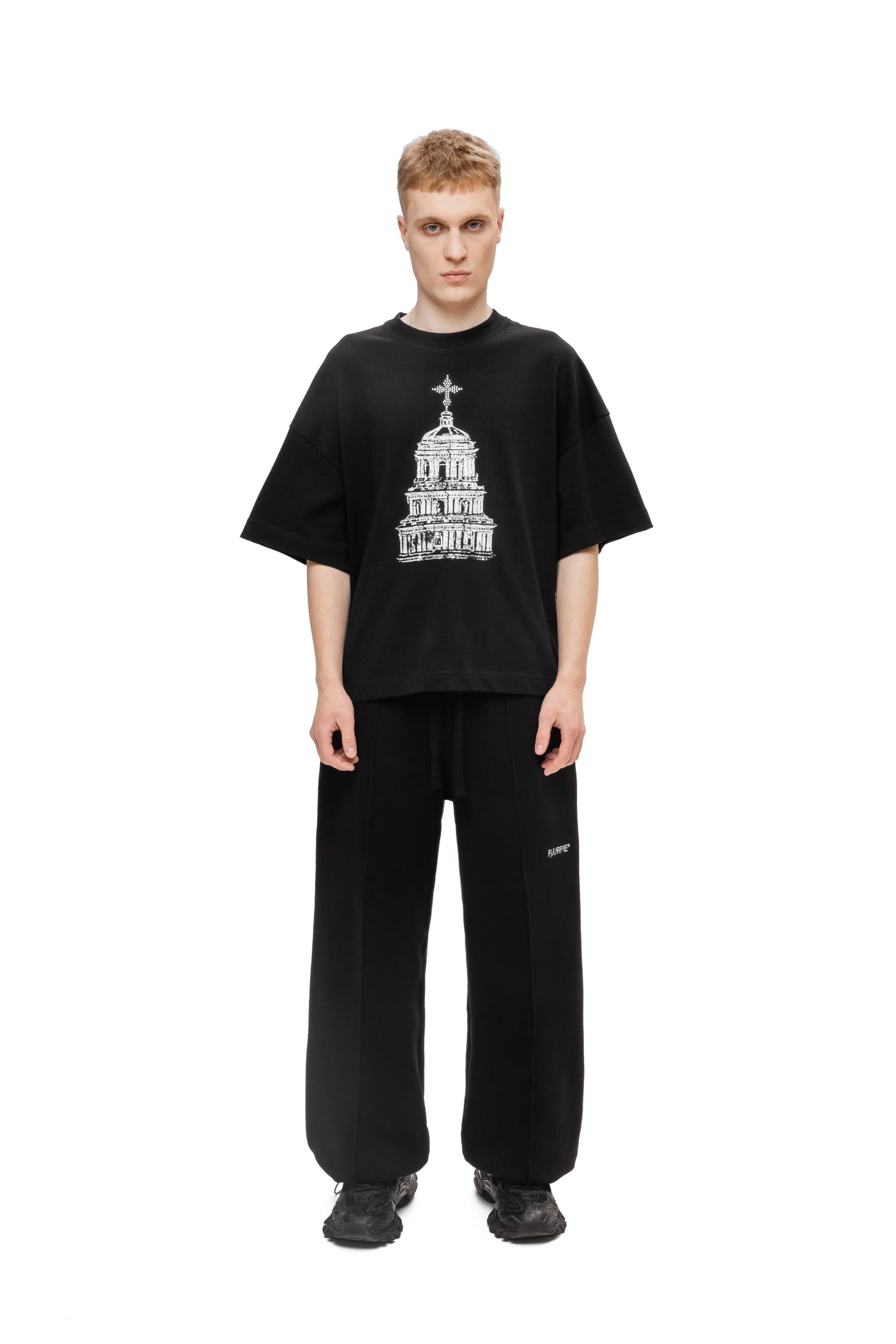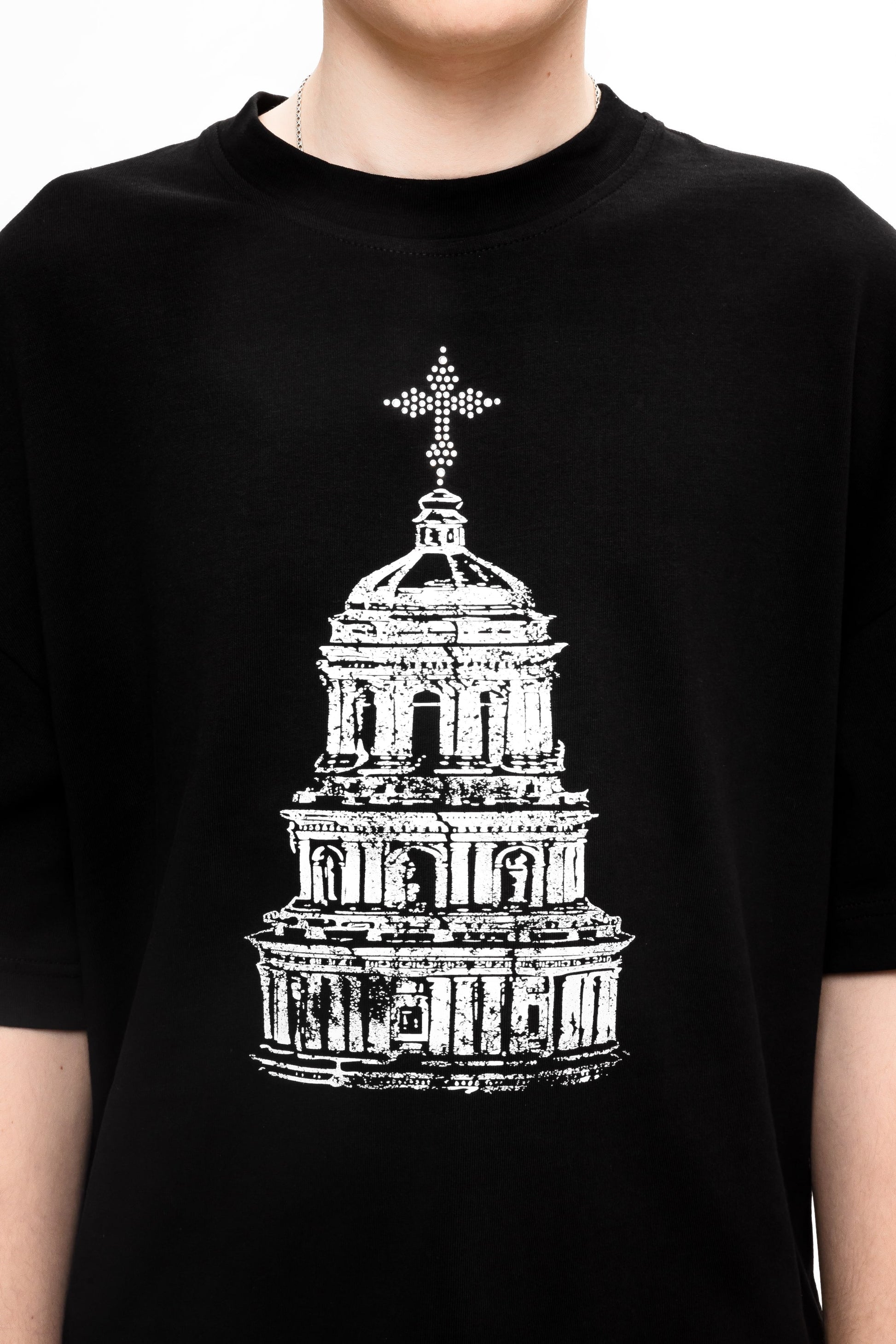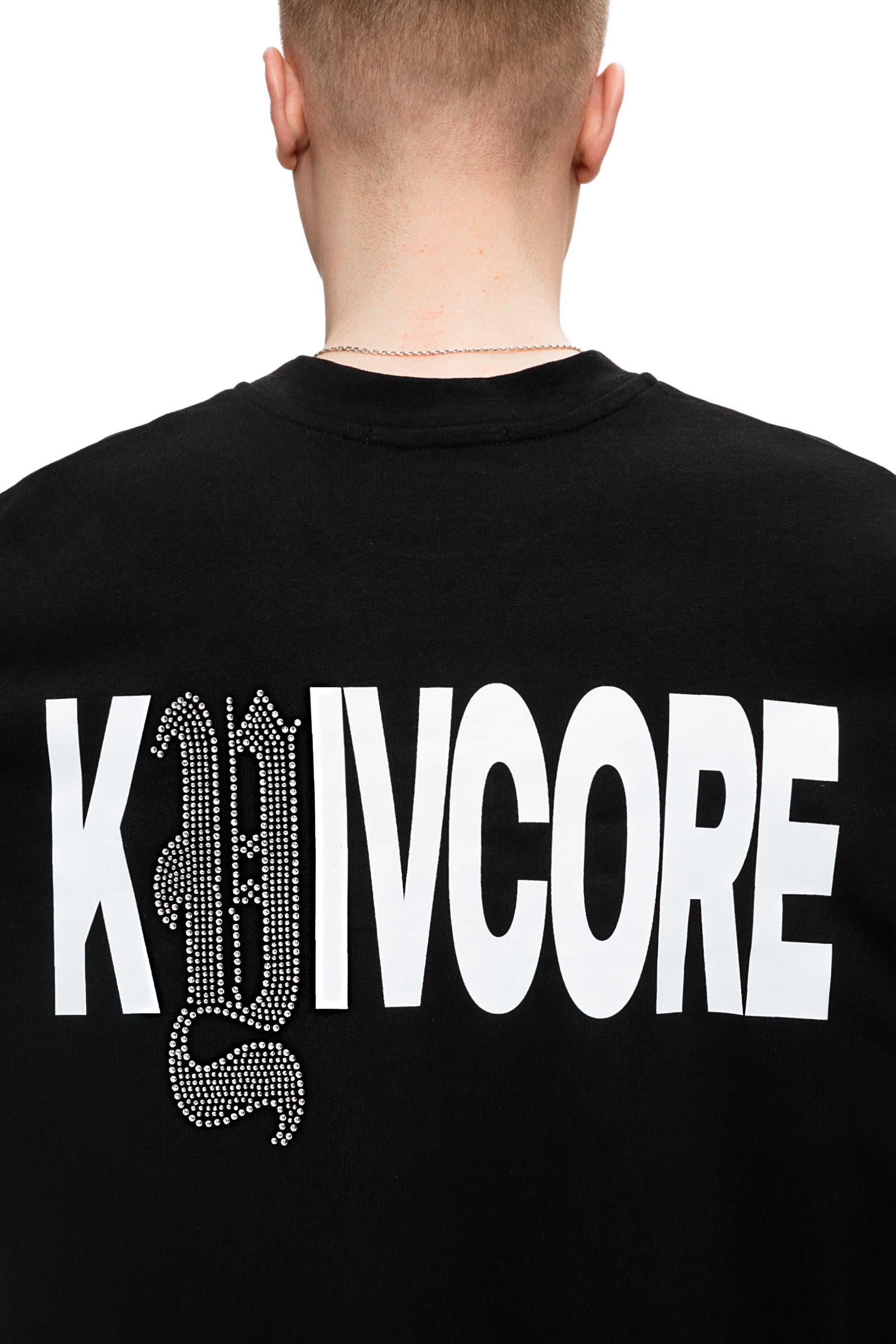 Футболка свободного кроя, изготовленная из хлопчатобумажной ткани 250GSM. С круглым вырезом горловины, принтом на груди, украшенной крестом аппликации страз и надписью на спине Kyivcore, выделенной буквой из страз.