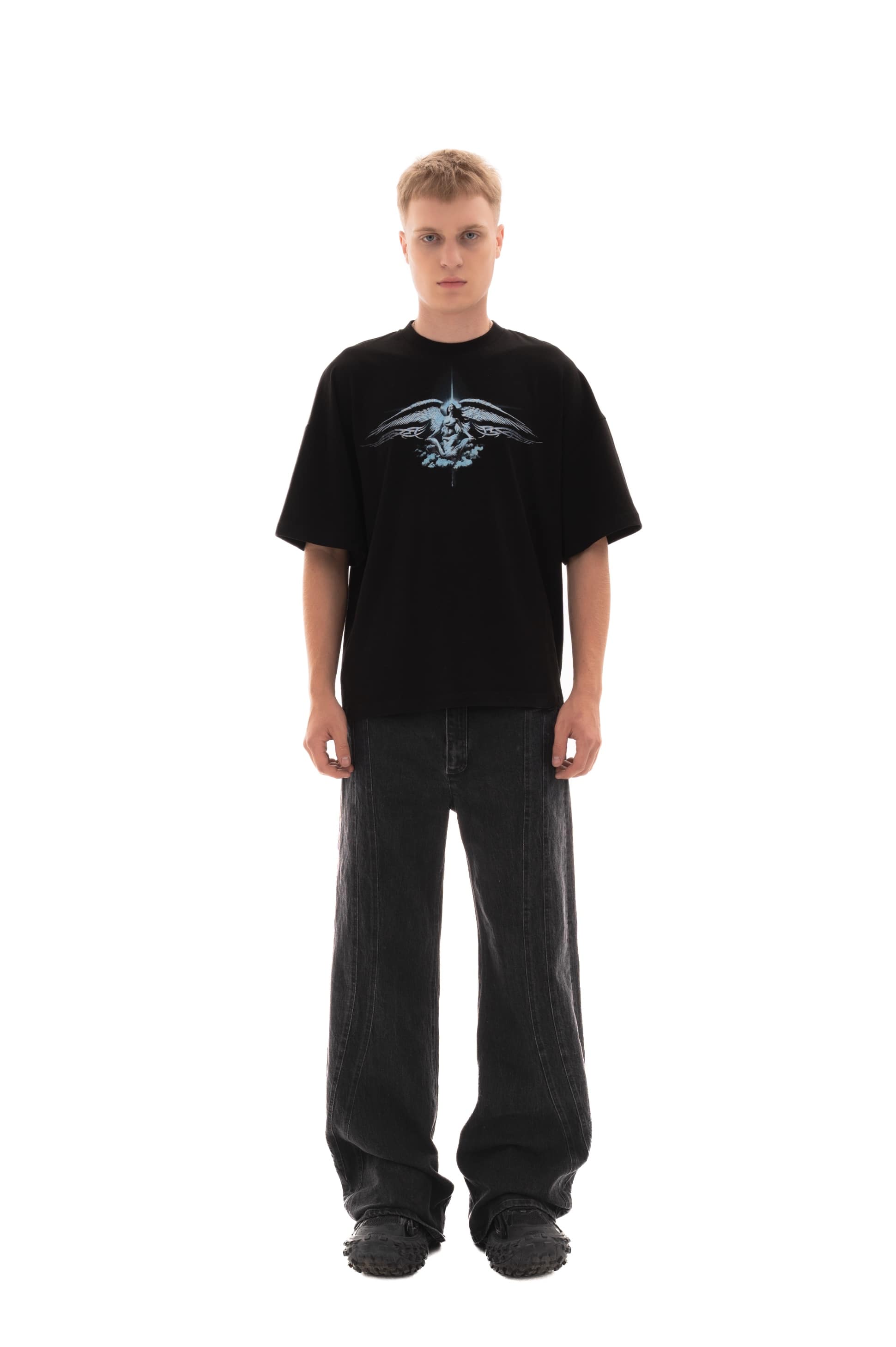 Футболка свободного кроя, изготовлена из хлопчатобумажной ткани 190GSM. С круглым вырезом горловины и принтом на груди.